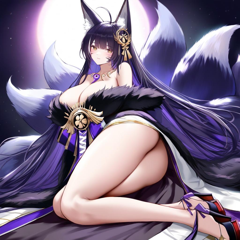 This digital anime-style illustration depicts a voluptuous, fox-eared woman with long, flowing black hair and striking purple eyes. She wears a black, fur-trimmed robe with gold and purple accents, revealing ample cleavage and a large, round buttock. Her nine large, white-tipped black fox tails fan out behind her. She has a golden hairpiece with a circular design and a purple gem. She is kneeling, with one leg slightly forward, on a dark, starry background. Her high heels are red with purple straps. The image is highly detailed, with a focus on her sensual, alluring pose.