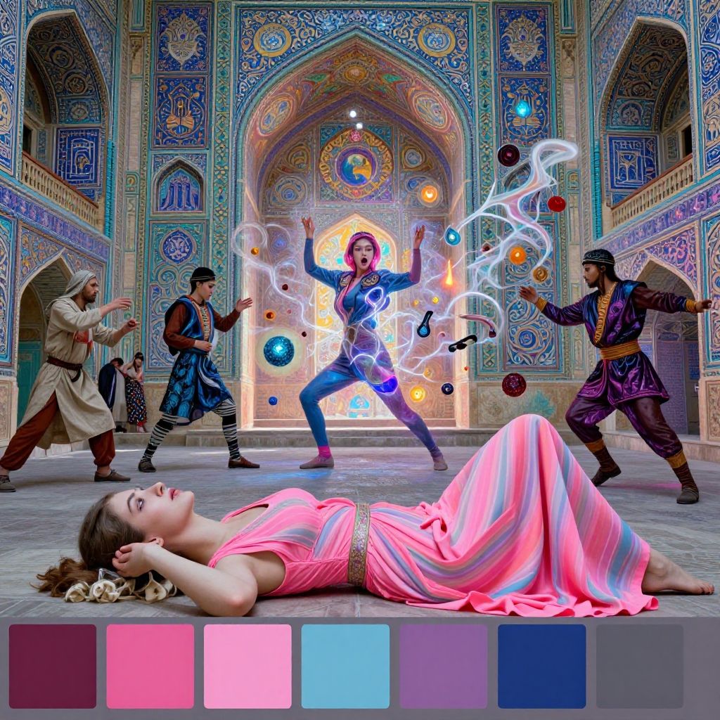 This photograph, digitally enhanced, depicts a vibrant scene in a richly decorated mosque with intricate blue, green, and gold tilework. In the foreground, a young woman with fair skin and blonde hair lies on her back, wearing a flowing pink and white striped dress. Her eyes are closed, and she appears serene. In the background, four men in traditional, colorful attire perform a dynamic dance. One central man, illuminated by a bright light, levitates glowing orbs with an electric blue aura. The men's outfits include tunics and pants in shades of purple, blue, and brown. The mosque's arches and patterns add a regal, historical ambiance. Below the woman, a color palette bar displays pink, blue, and purple swatches.
