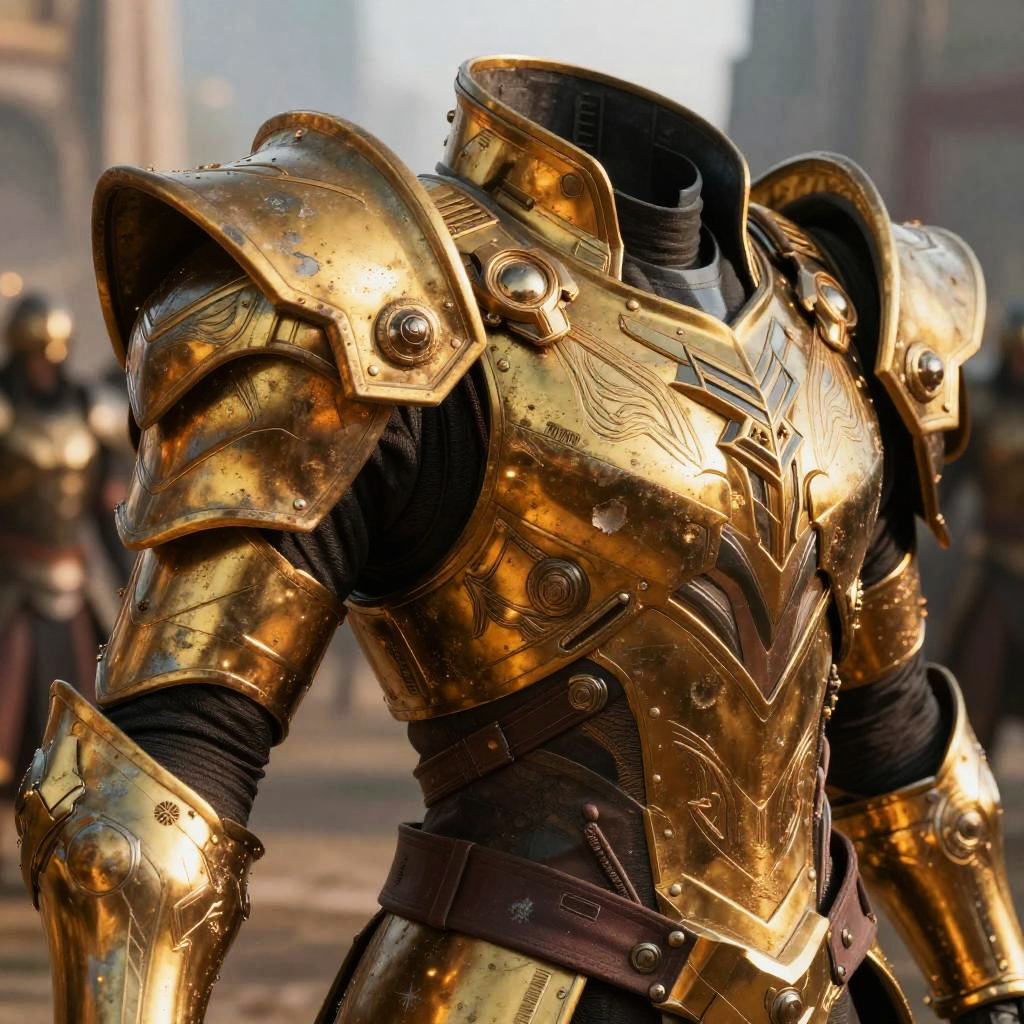 Gold shoulder pads shining under dramatic lighting, futuristic armor with intricate engravings, worn by a heroic warrior in a fantasy battlefield, high detail, vibrant colors