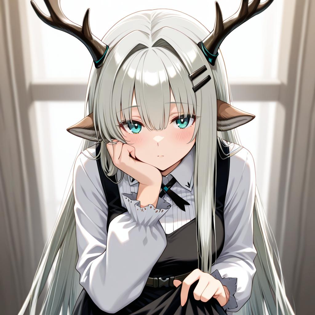 Digital illustration of a female anime character with long grey hair, blue eyes, deer ears, and antlers. She is wearing a black pinafore dress over a white long-sleeve blouse with frilled cuffs and two hairclips on her bangs. The character appears contemplative, resting her cheek on her hand against a softly lit indoor background.