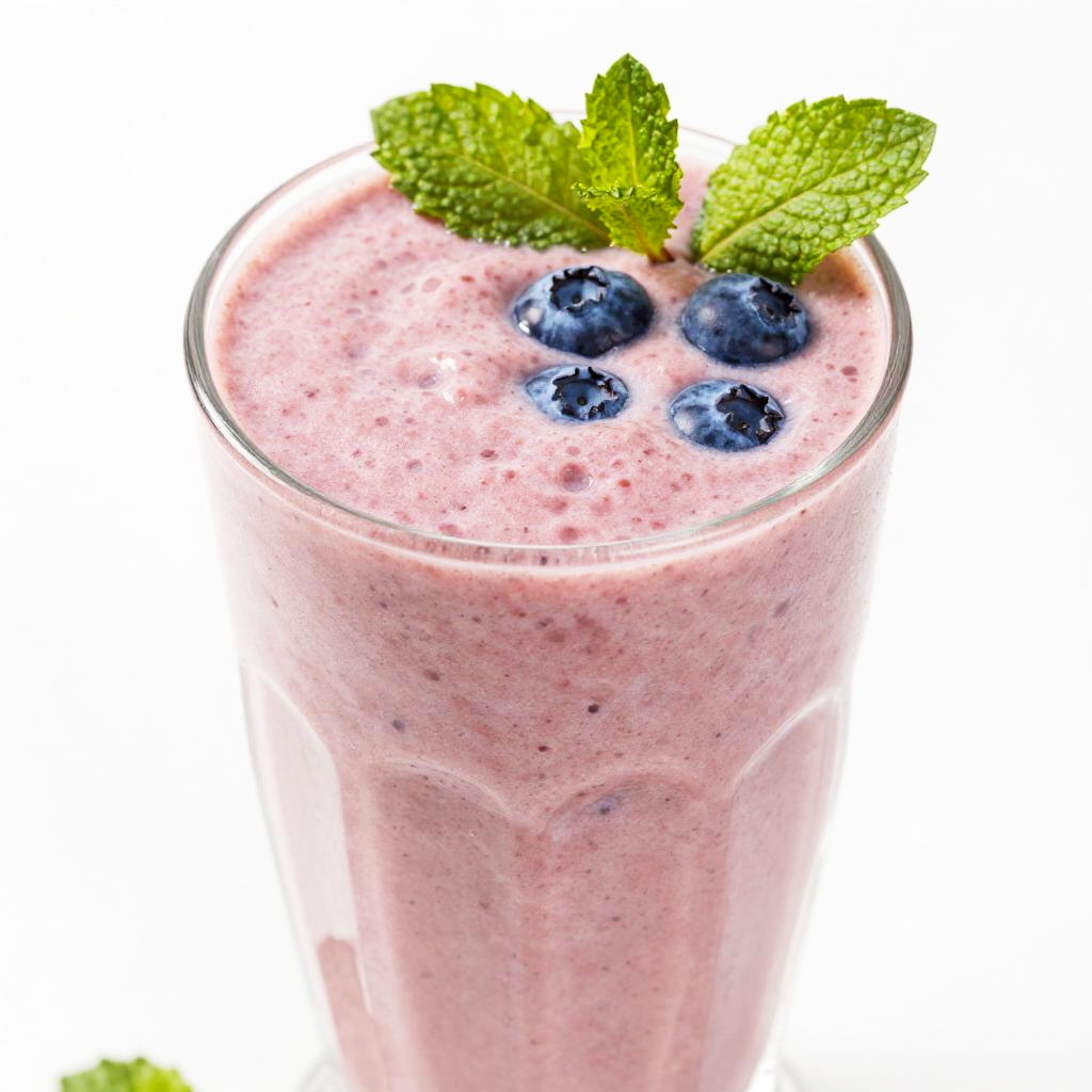 A close-up photo of a tall glass filled with a pink, blended smoothie. The smoothie is speckled with dark blueberries and has a slightly textured surface. Fresh green mint leaves and a few more blueberries are garnishing the top. The glass is tilted, showing the creamy consistency of the smoothie. The background is plain white, making the colors pop.