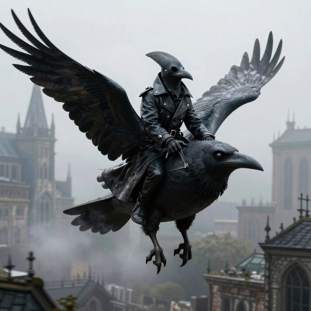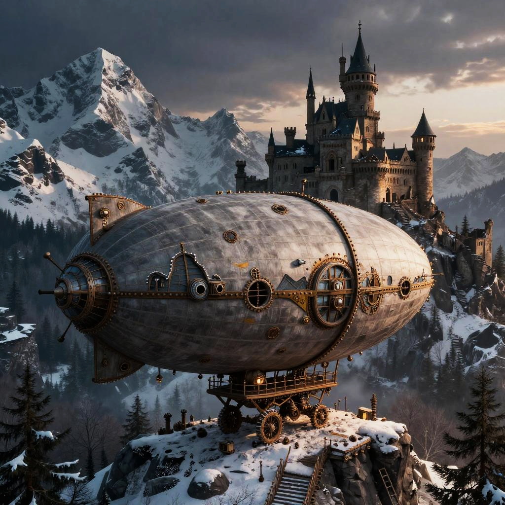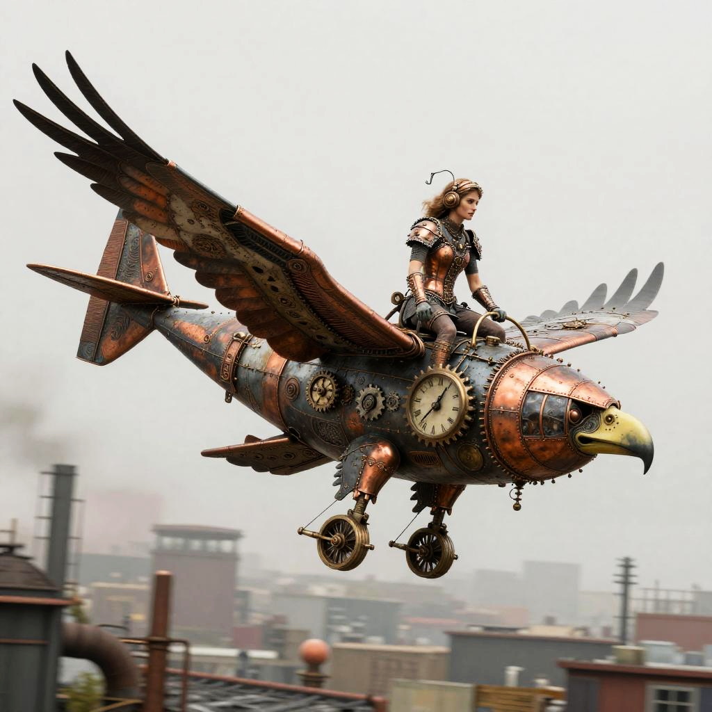 Zeppelin A trippy, hellish steampunk aviator, wearing a copper gear-laden corset, riding a clockwork falcon, set in industrial rooftop. Inspired by Ian McQue, hyper-real with intricate outlines.