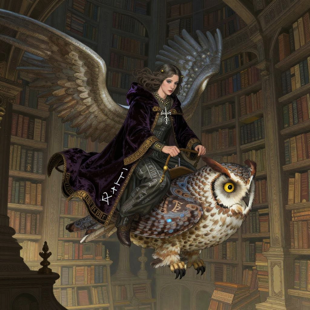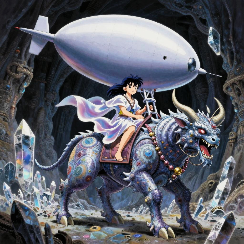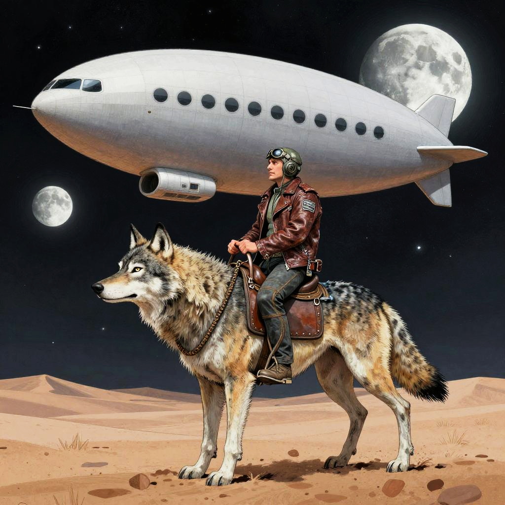 Zeppelin A trippy, hellish steampunk aviator, wearing a copper gear-laden corset, riding a clockwork falcon, set in industrial rooftop. Inspired by Ian McQue, hyper-real with intricate outlines.