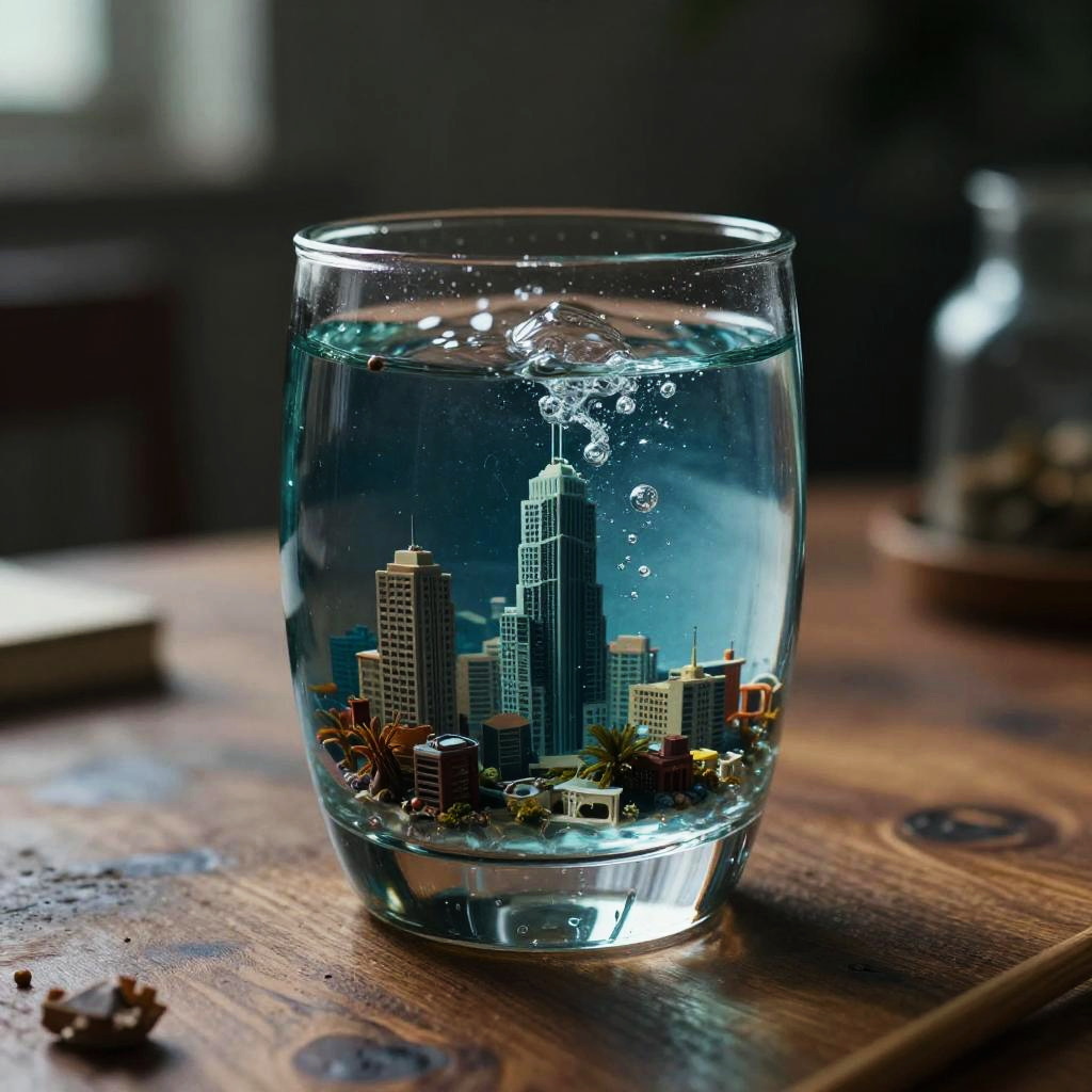 Glassworld, cinematic still, hdr, raw photo of a glass filled with an underwater city on a wooden table, 4k, uhd, masterpiece
