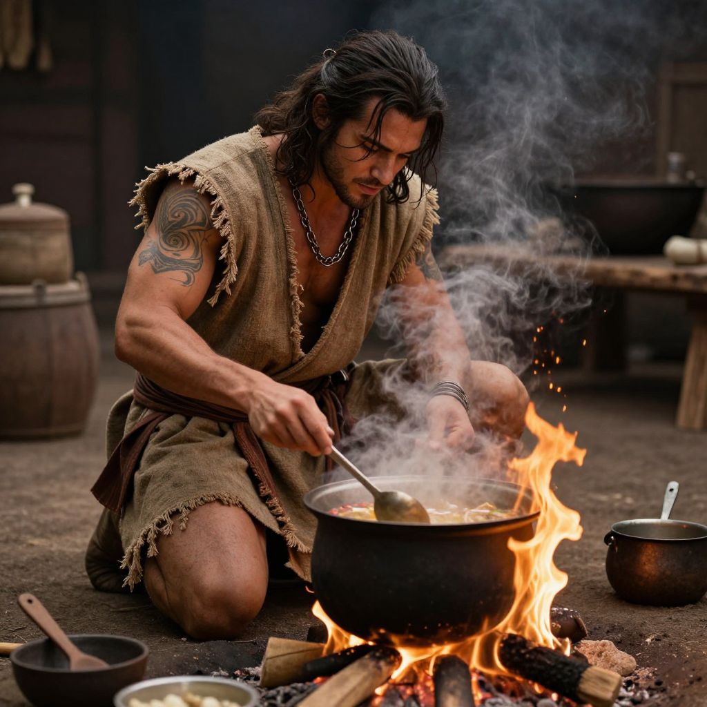 In this hyper-realistic, high-definition image, a muscular man from ancient times is engrossed in the art of cooking soup. He is clad in a tattered, earth-toned robe that drapes over his shoulders, revealing a muscular torso adorned with intricate tattoos. His long, dark hair is tied back, and a chain necklace graces his neck, adding to his rugged appearance. The man is kneeling on the ground, his attention focused on a large, steaming cauldron that sits atop a small, open fire. The flames dance and flicker, casting a warm glow over the scene. Surrounding the cauldron are various cooking utensils and ingredients, including a wooden spoon, a small bowl, and a pot, all contributing to the authenticity of the moment. The overall composition is rich in detail, with the man and his surroundings meticulously crafted to evoke a sense of timelessness and the simple pleasures of ancient culinary arts.