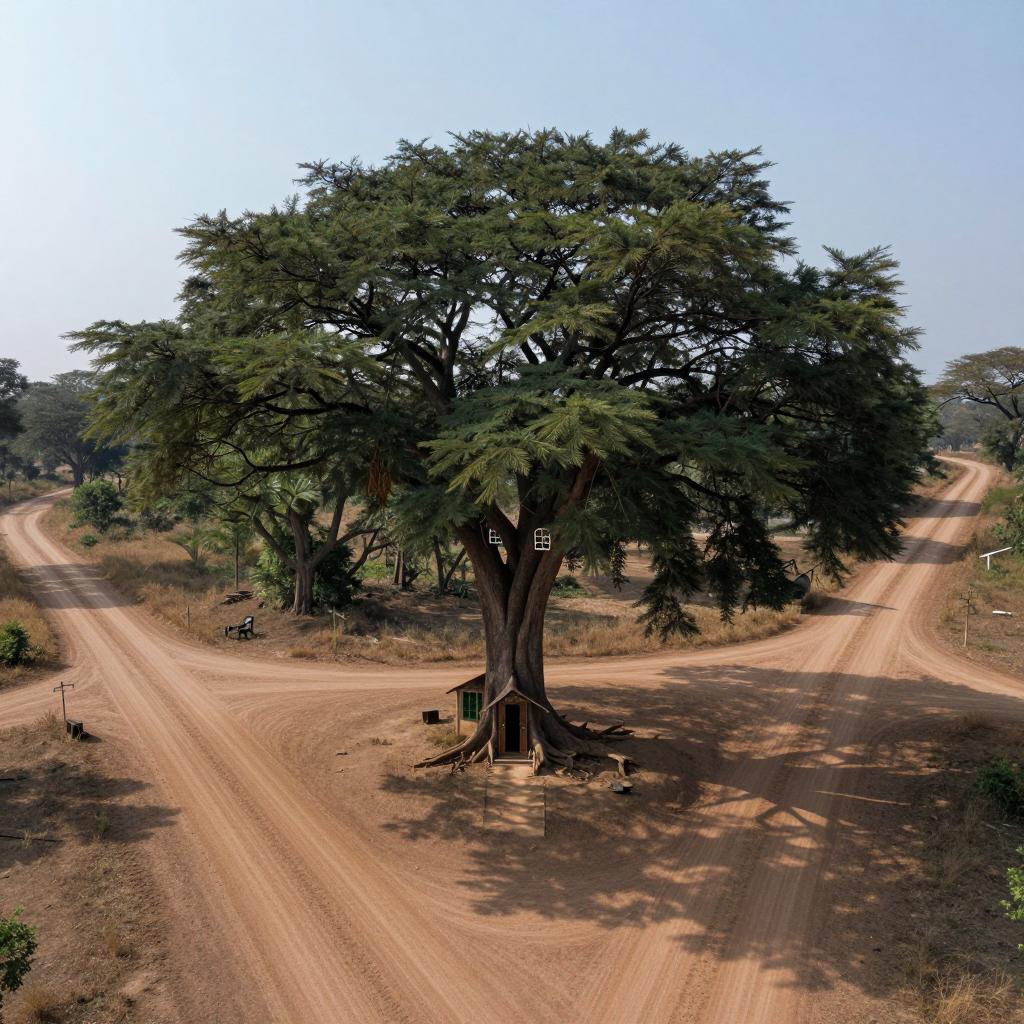 Simba large trunked tree with a door into the trunk, there are windows on the barnk and up the tree, it is the tallest tree in the area::3 the tree site on on the intersection of dirt roads, forest overhang line the roads::2 wide angle shot from above showing the scale of the tree::1,