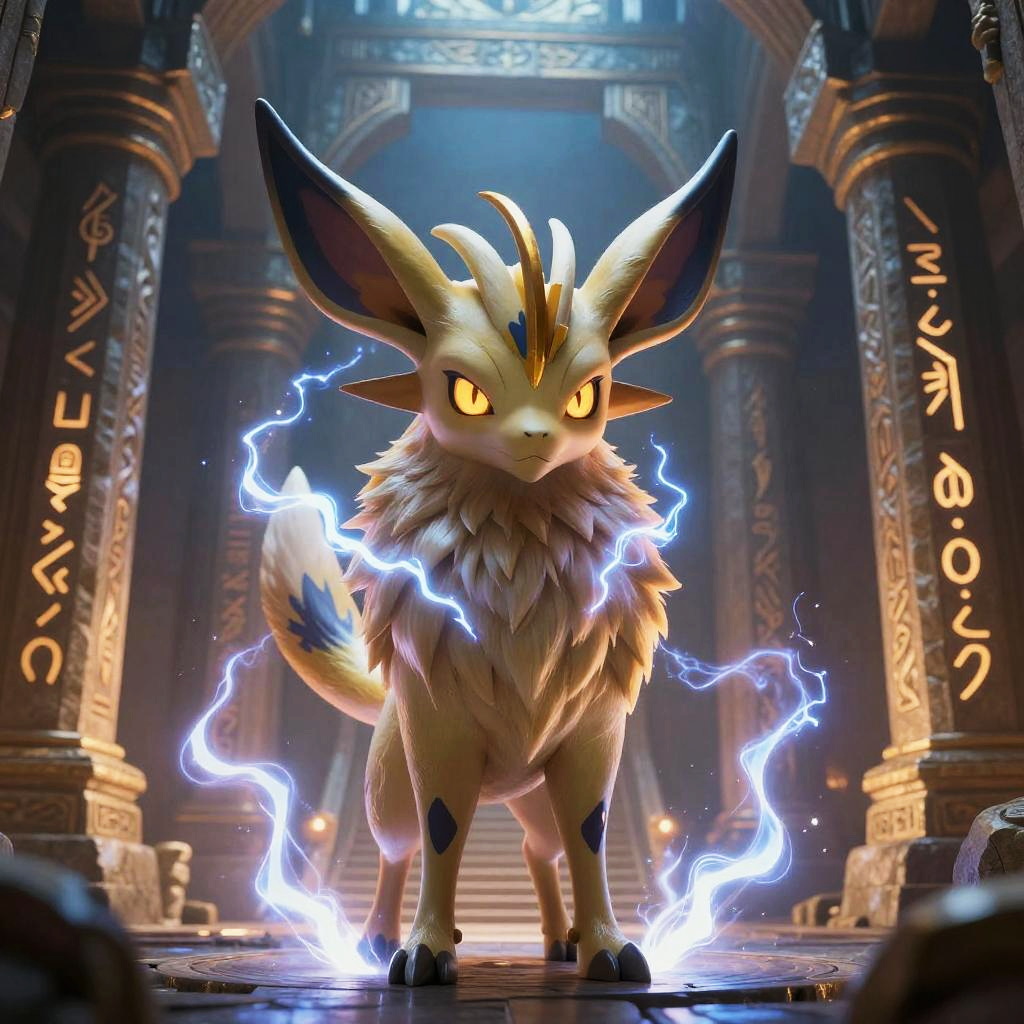 Portrait of Zeraora in a mystical ancient temple, electric energy swirling around its body, intricate glowing runes on stone walls behind, soft ambient light highlighting fur texture, intense gaze, fantasy art style with a blend of electrifying blue and gold tones.
