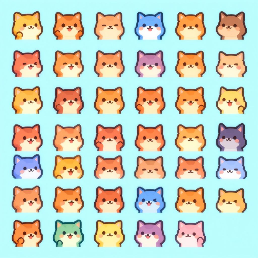 AI sprite sheet generator designing cute animal avatars in pixel art style, featuring multiple facial expressions and gestures, colorful palette, smooth animation frames arranged in a neat grid, digital fantasy theme with subtle glowing effects.