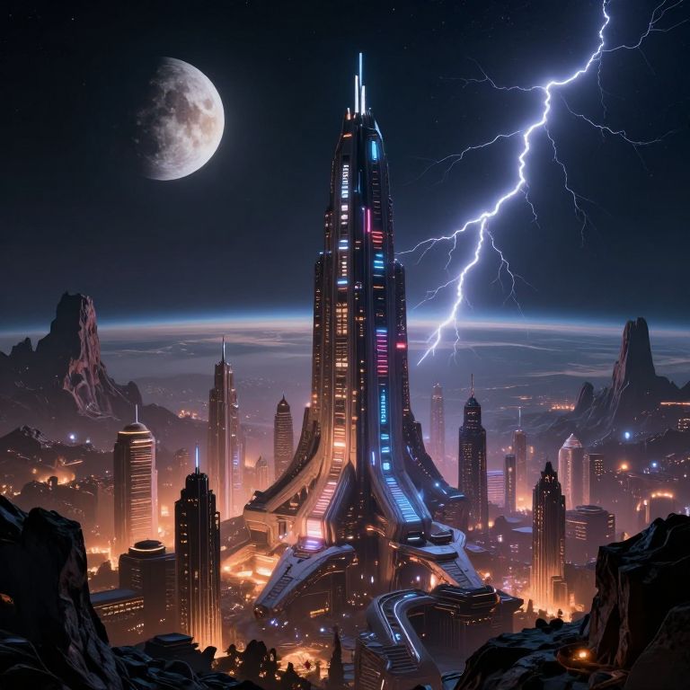 Digital art of a futuristic cityscape with a towering central skyscraper, illuminated by neon lights, under a moonlit sky with striking blue lightning bolts.