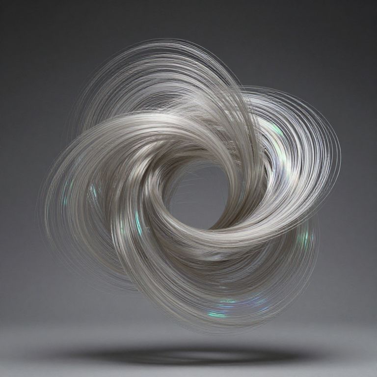Spun fibers twisting and turning into a dynamic abstract sculpture, floating in mid-air with shimmering metallic textures and iridescent colors that evoke a sense of motion and fluidity.