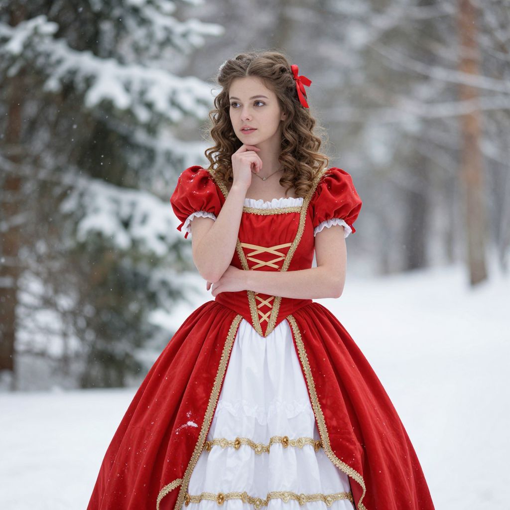 A young woman with curly brown hair, wearing a vibrant red and white ball gown with gold trim and a red ribbon in her hair, stands in a snowy forest. Her dress has puffed sleeves and a corset-style bodice. She gazes off to the side, touching her chin with her right hand. The background features snow-covered evergreen trees and a soft, wintry light.