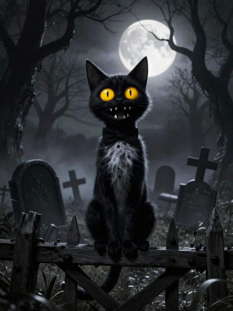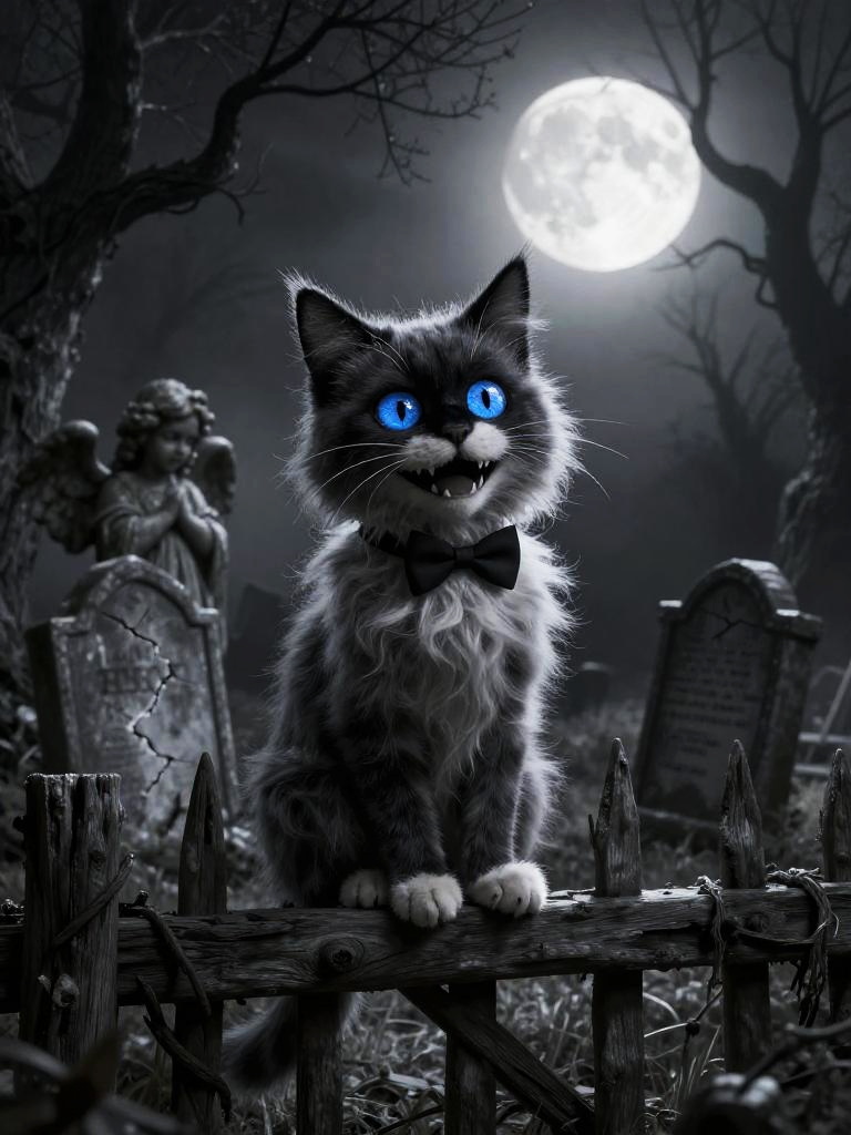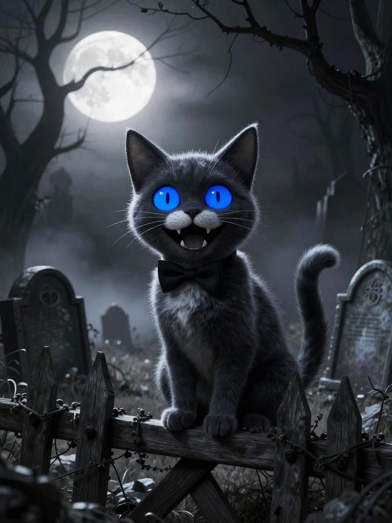 Digital artwork of a glowing blue-eyed, gray cat with a toothy grin sitting on a wooden fence in a spooky, moonlit cemetery with gravest