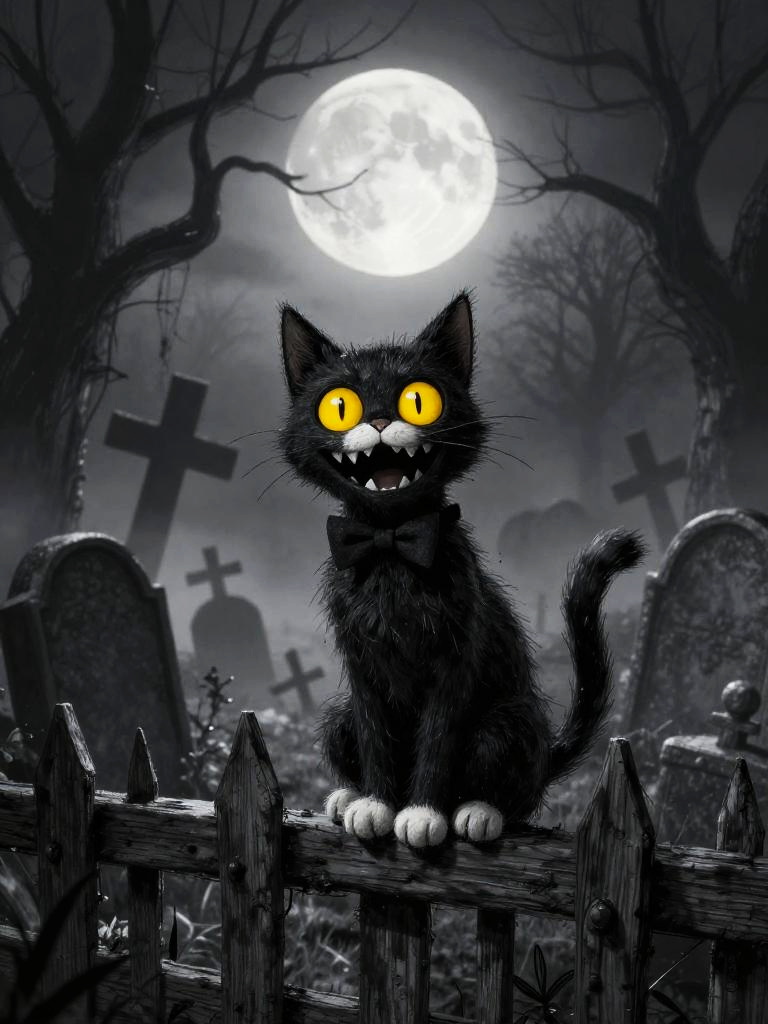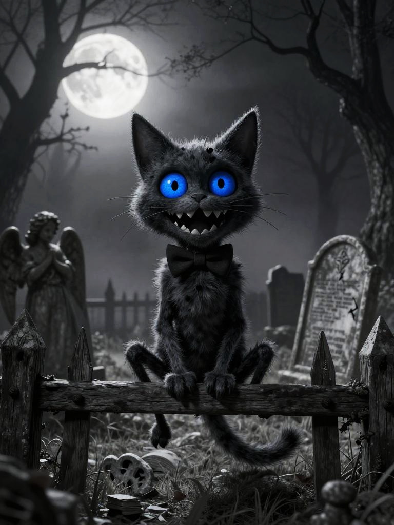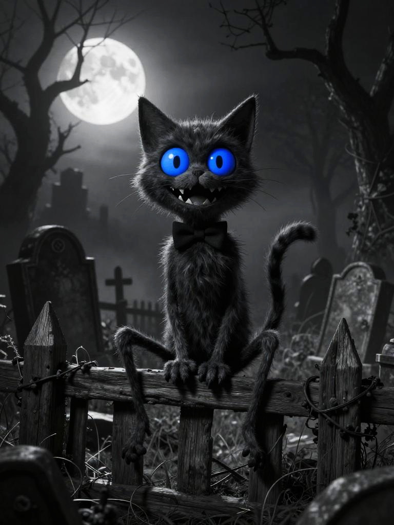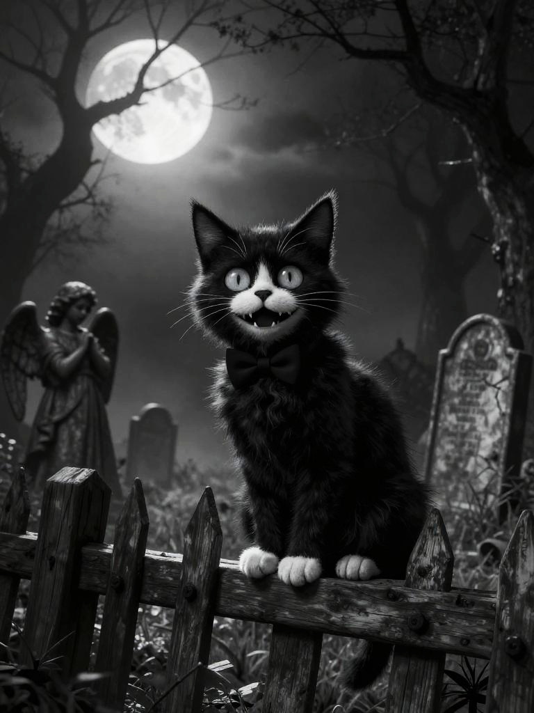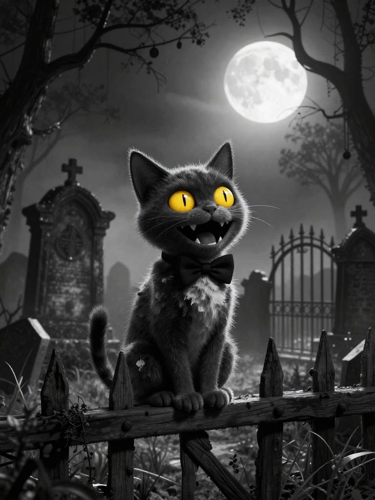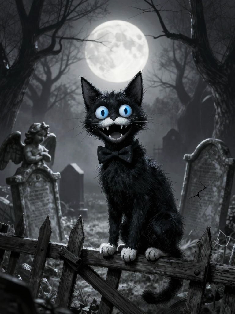 Spooky stylized cat perched on a crooked wooden fence in an old graveyard, lean dark gray cat with patchy white chest, sleek and shiny fur, huge grinning mouth and wide ghostly blue eyes, bow tie at its neck, behind it overgrown graves with tangled vines under a bright full moon, twisted trees and fog, high-contrast soft backlit glow around the cat light, monochrome with subtle accent tones, dark whimsical fantasy illustration, dramatic wide shot with the cat centered in frame