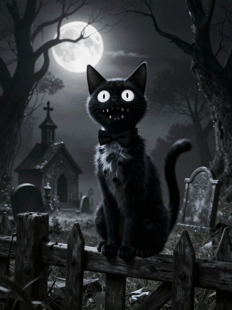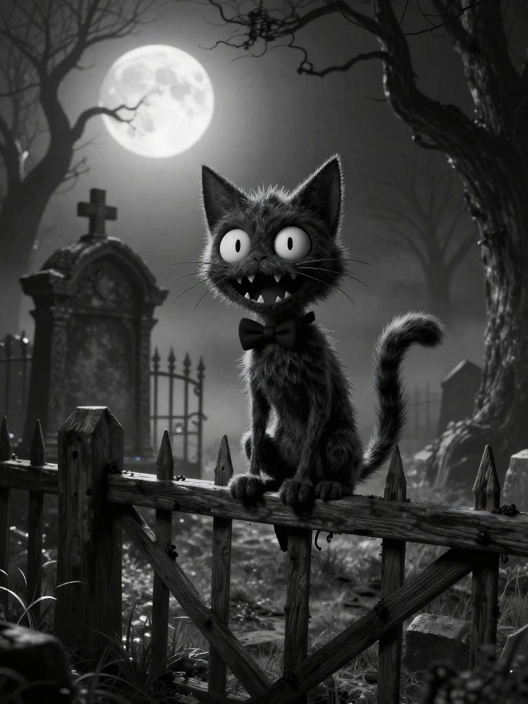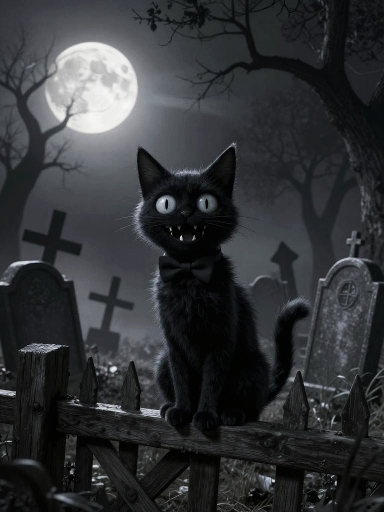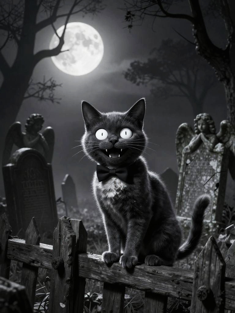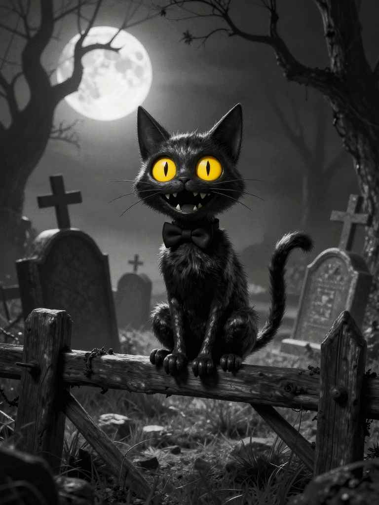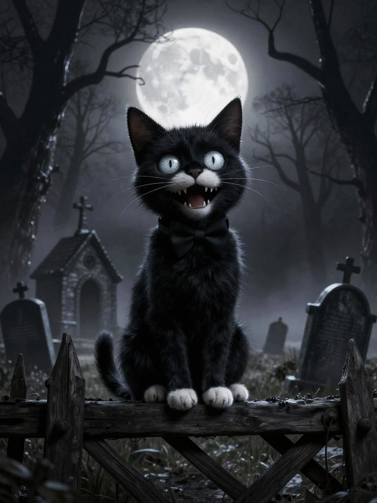 Spooky stylized cat perched on a crooked wooden fence in an old graveyard, lean dark gray cat with patchy white chest, sleek and shiny fur, huge grinning mouth and wide ghostly blue eyes, bow tie at its neck, behind it overgrown graves with tangled vines under a bright full moon, twisted trees and fog, high-contrast soft backlit glow around the cat light, monochrome with subtle accent tones, dark whimsical fantasy illustration, dramatic wide shot with the cat centered in frame