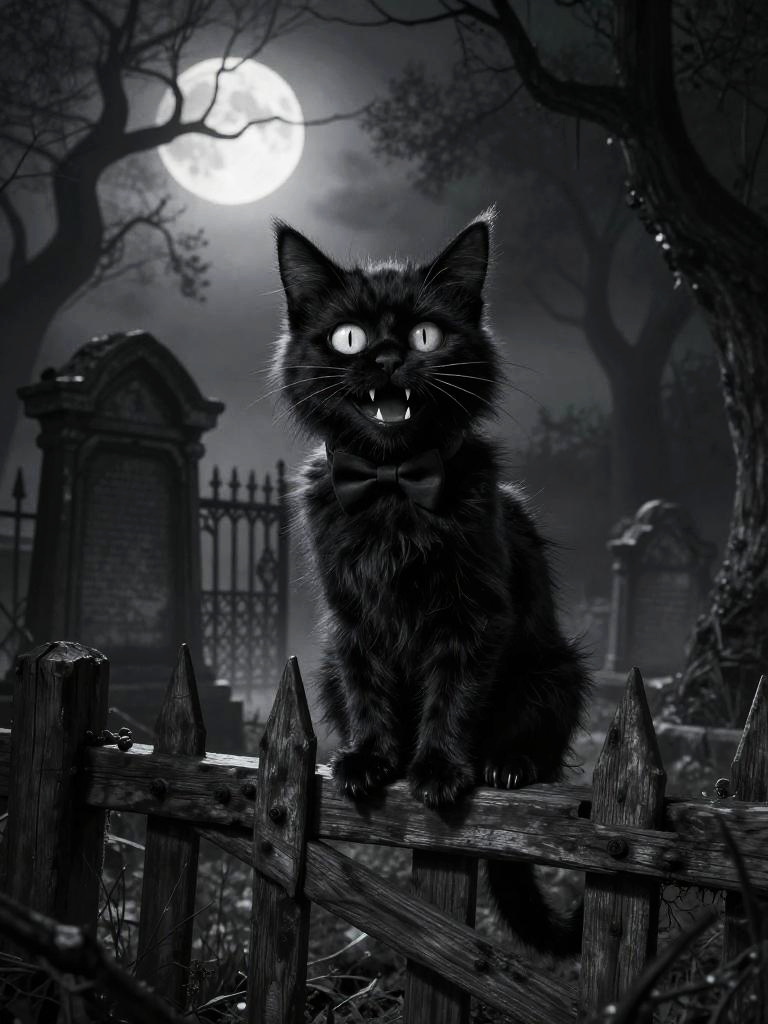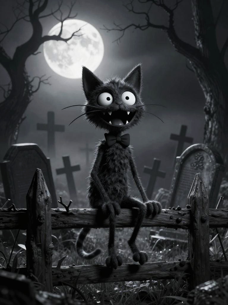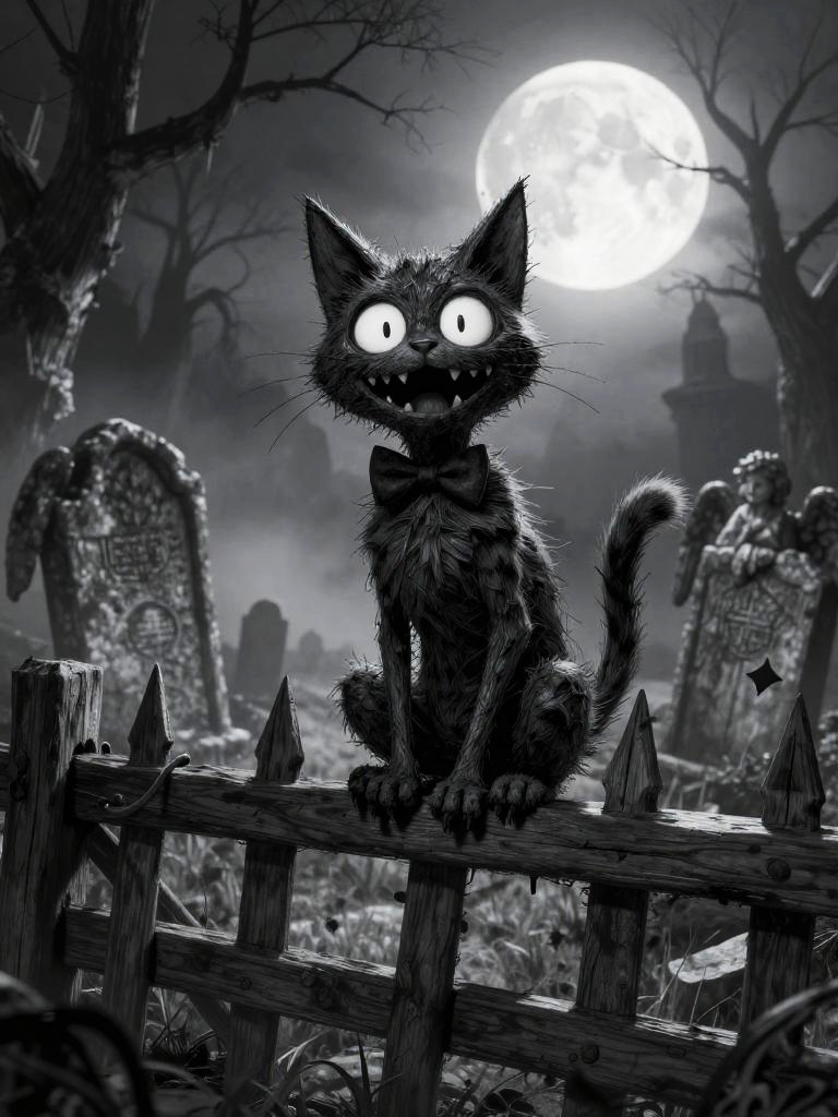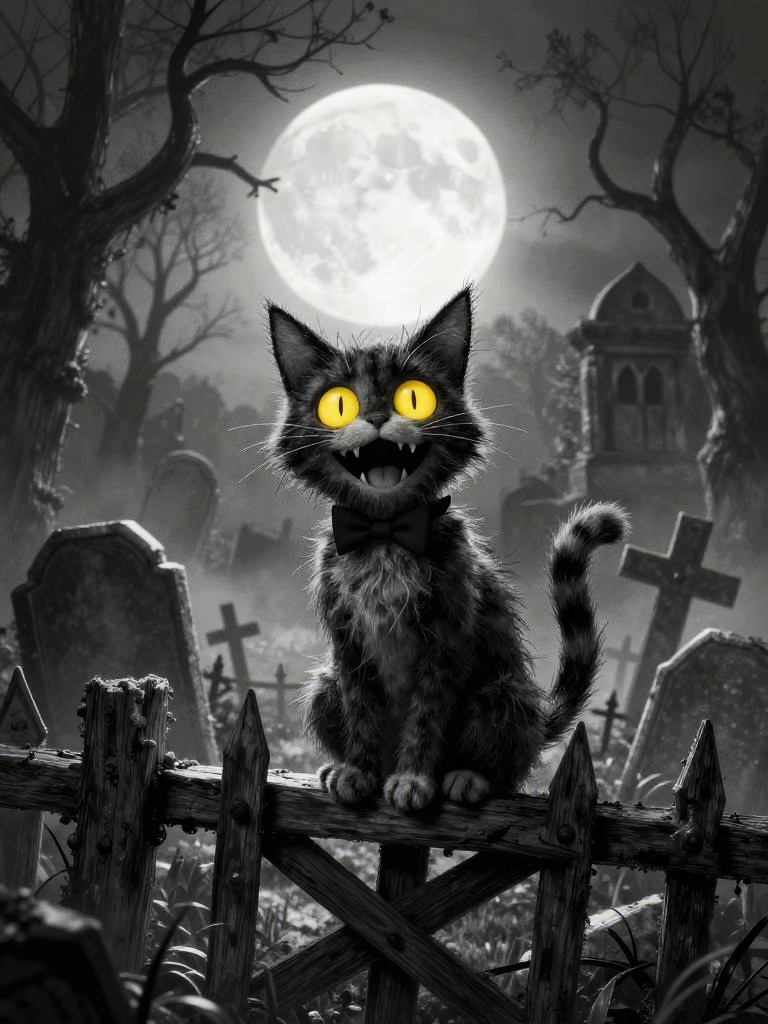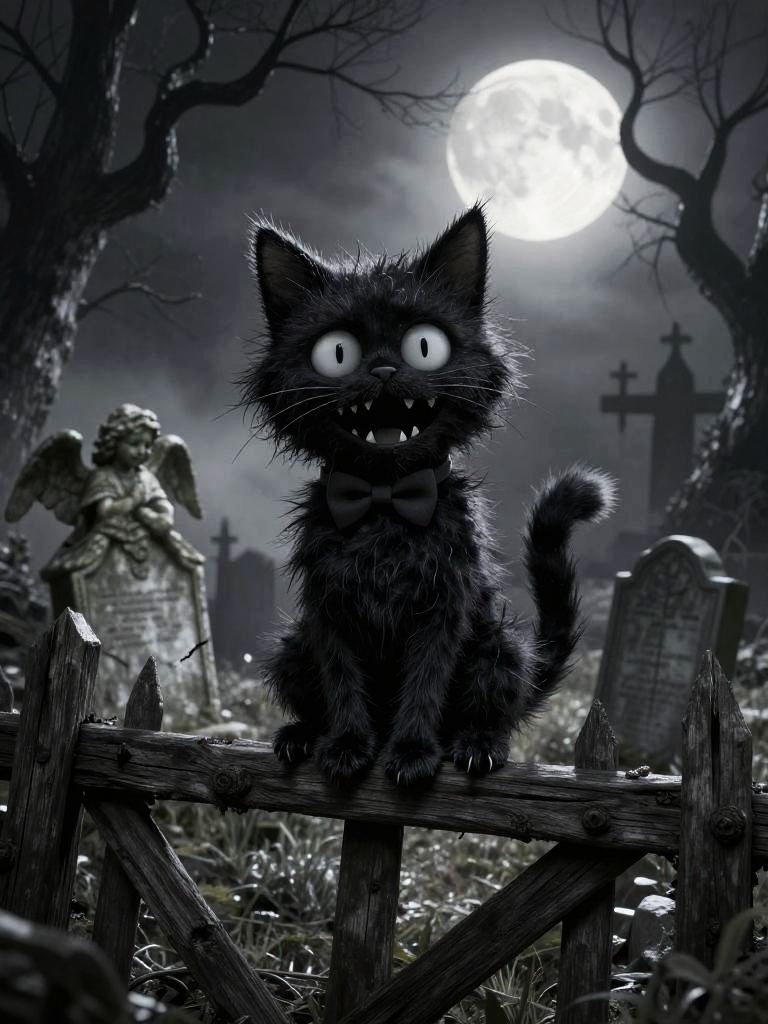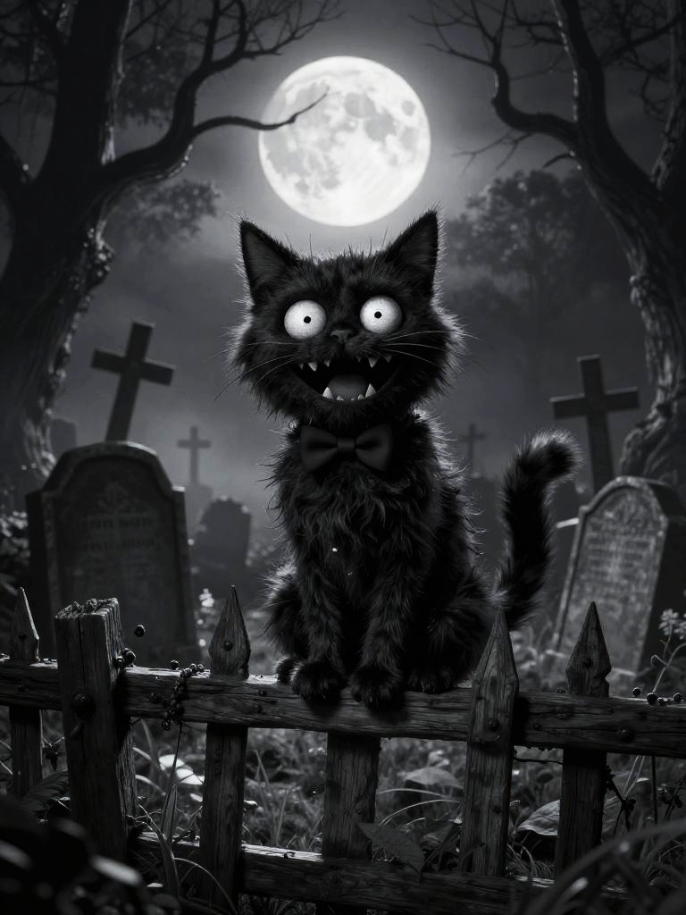 Spooky stylized cat perched on a crooked wooden fence in an old graveyard, lean dark gray cat with patchy white chest, sleek and shiny fur, huge grinning mouth and wide ghostly blue eyes, bow tie at its neck, behind it overgrown graves with tangled vines under a bright full moon, twisted trees and fog, high-contrast soft backlit glow around the cat light, monochrome with subtle accent tones, dark whimsical fantasy illustration, dramatic wide shot with the cat centered in frame