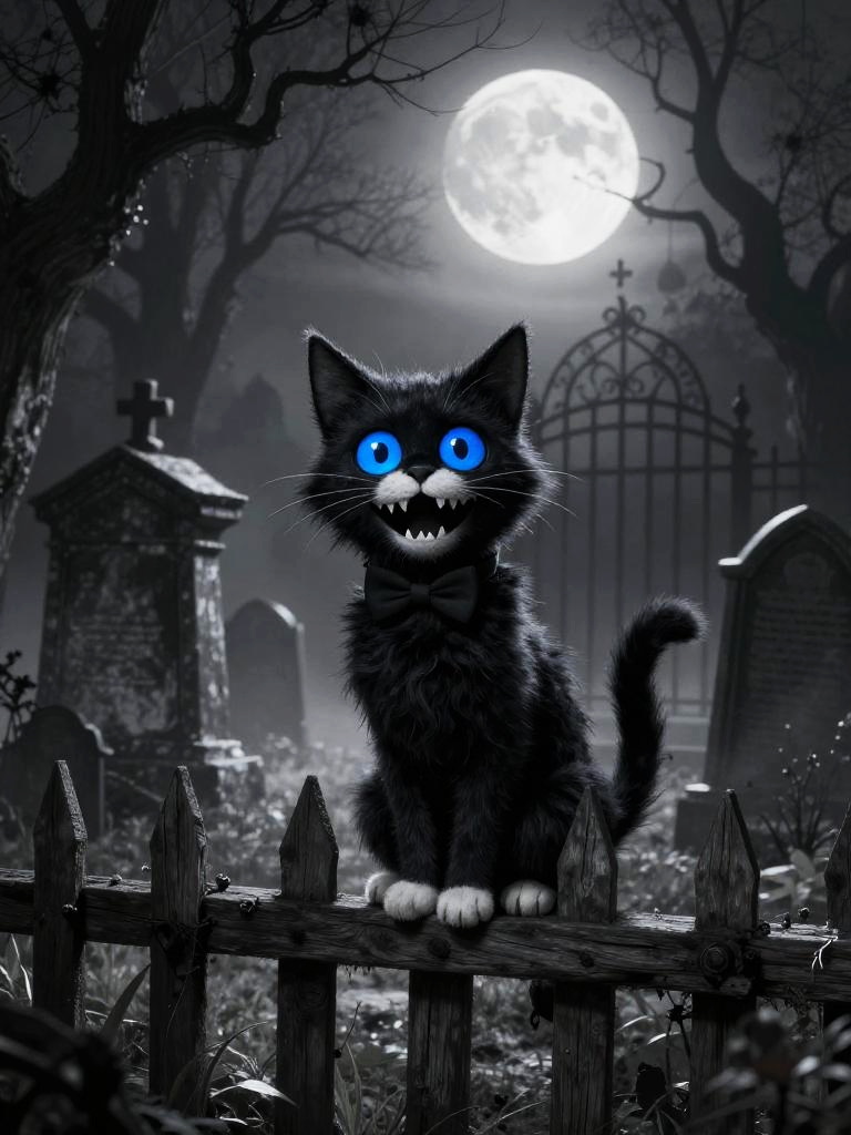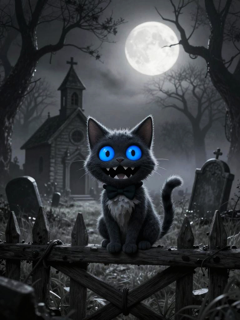Digital artwork depicting a cute, gray tabby cat with large, glowing blue eyes and a small white patch on its nose, sitting on a wooden fence in a spooky graveyard at night. The cat has a slight grin, showing its tiny fangs. The background features a full moon shining brightly in a dark, cloudy sky, with barren, twisted trees and old, weathered gravestones. The overall color palette is dark with shades of black, gray, and blue, creating a mysterious and eerie atmosphere. The cat's fur is textured, giving it a realistic appearance.