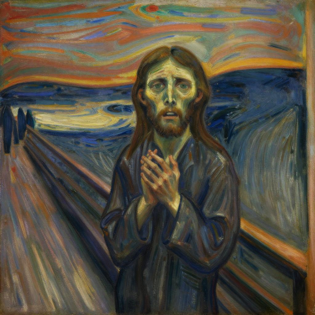 Jesus in the garden of Gethsemane, depicted as Jesus in a anguished prayerful moment. Rendered in expressionist painting with art by Edvard Munch. Focus on anxious facial features, swirling night sky, strained hands clasped and dramatic moody lighting.