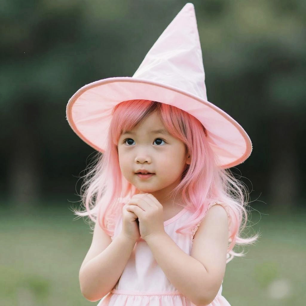 Photograph of a cute Asian toddler with pink hair and a white witch hat, wearing a white dress, standing outdoors with a blurred green forest background.