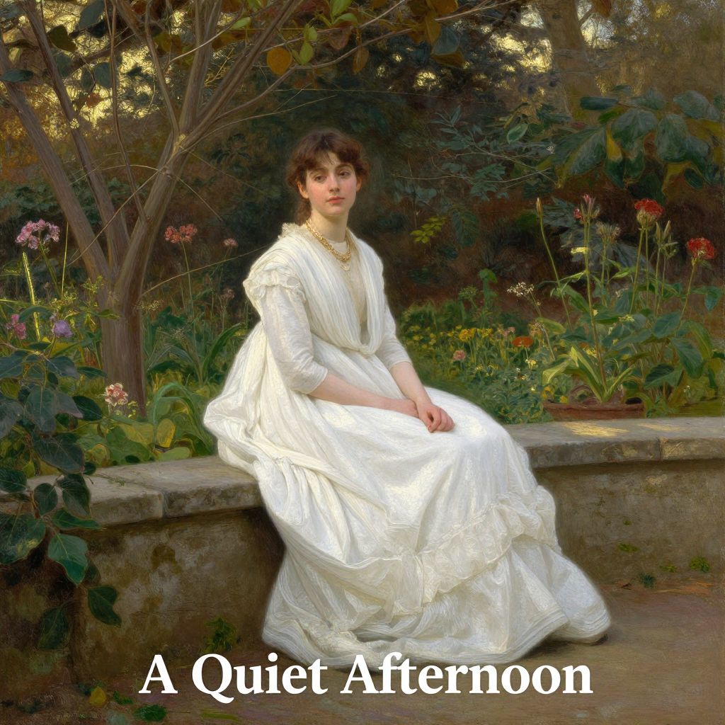 A serene oil painting titled \"A Quiet Afternoon\" by William Henry Lippincott, showcasing a woman in a flowing white gown seated gracefully on a stone ledge amidst a lush garden, bathed in the soft, natural light of a golden hour setting.