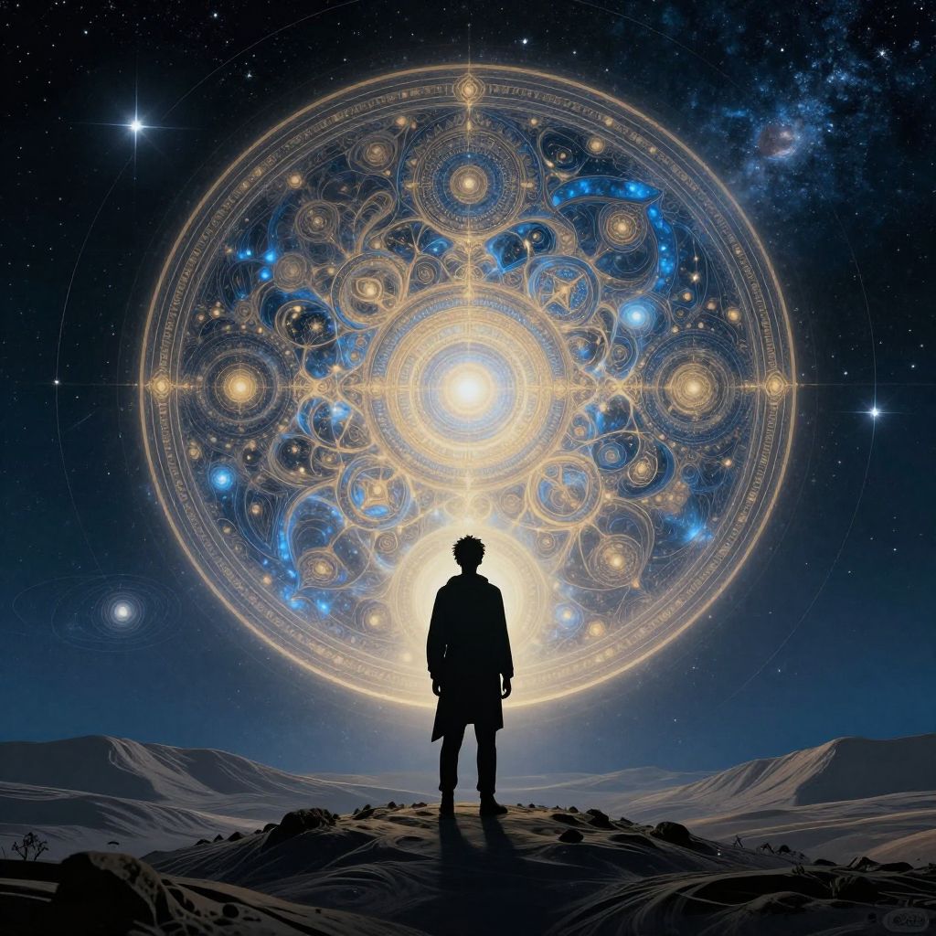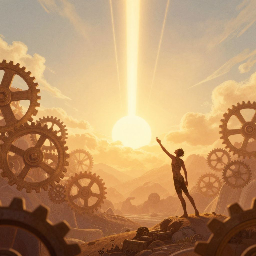 A surreal landscape representing human ability, with a figure reaching towards the sky, giant gears and light beams symbolizing skill and power, warm color palette, fantasy art style with intricate detail and atmospheric perspective