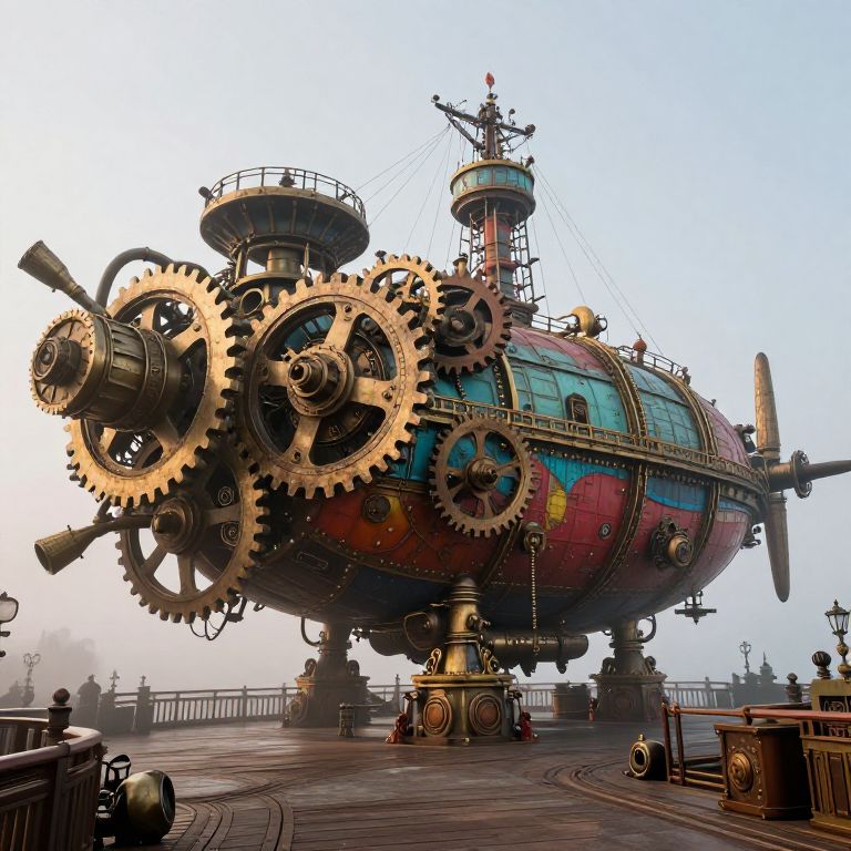 Architecture prompts illustrating a steampunk cityscape with copper and brass buildings, winding metal bridges, steam vents, and clock towers, accented with warm glowing lamps and a hazy industrial atmosphere under a cloudy sky.