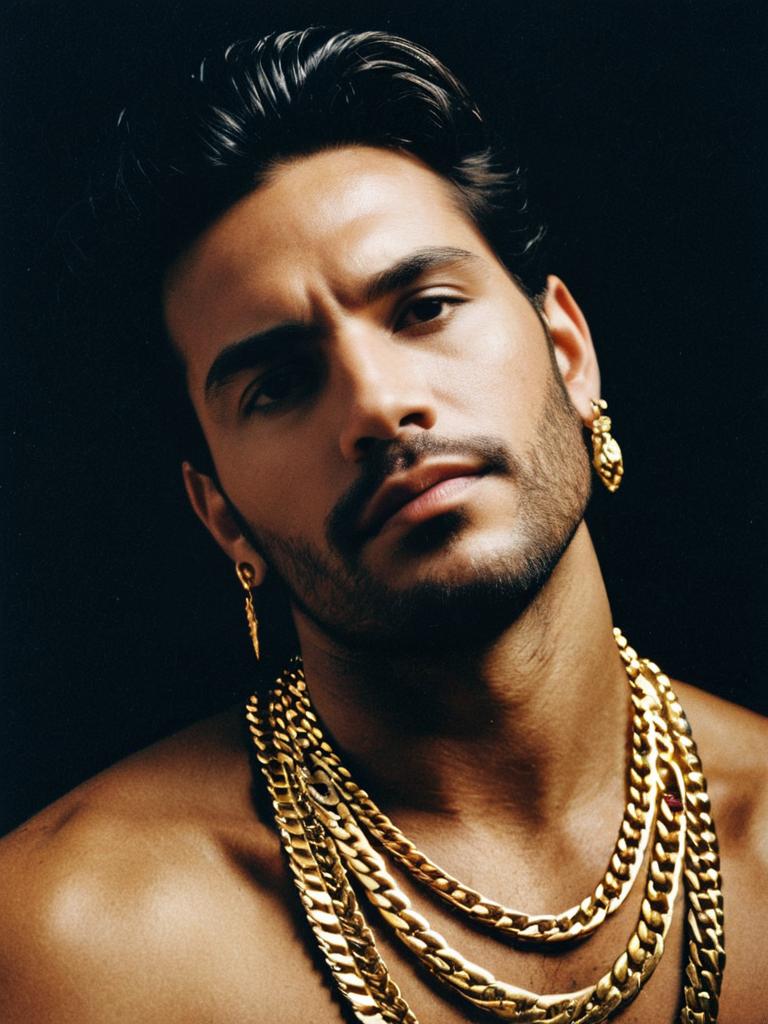 Man wearing Gold Jewelry Chain, photorealistic editorial glamour portrait