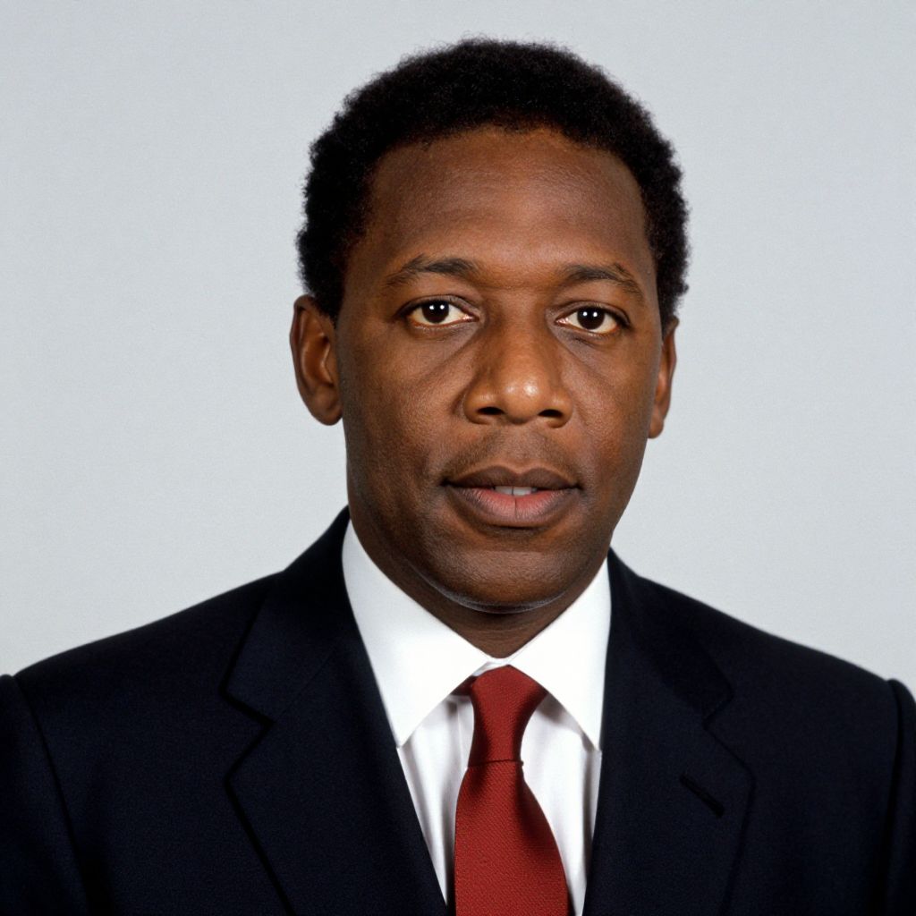 A close up of the united stats president wearing a suit and tie, black man, dark suit red tie, a character portrait by frank barrington craig, reddit, precisionism, 1970 s, provia, studio portrait