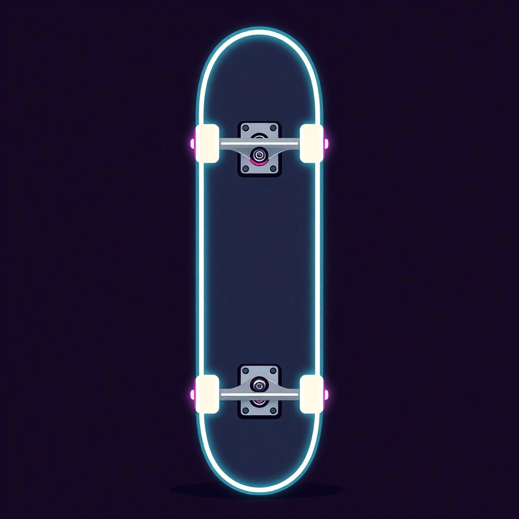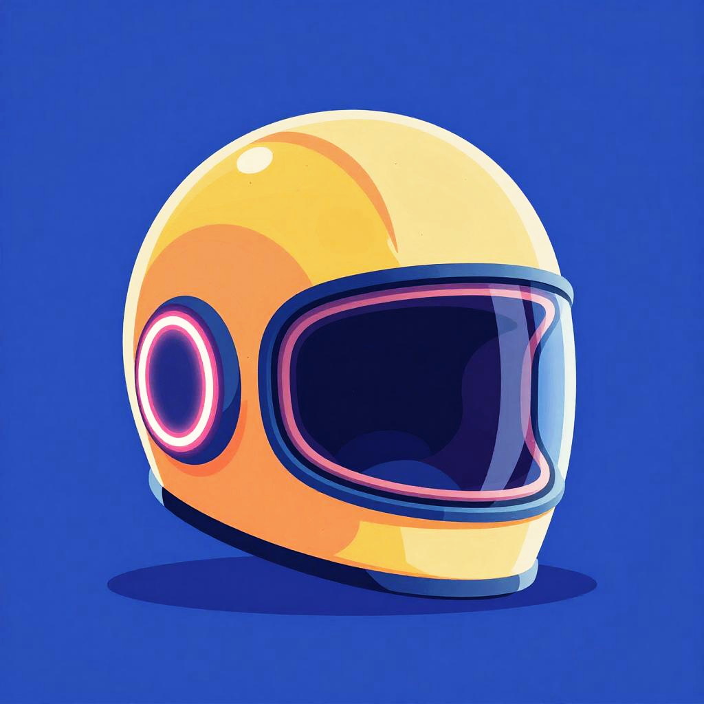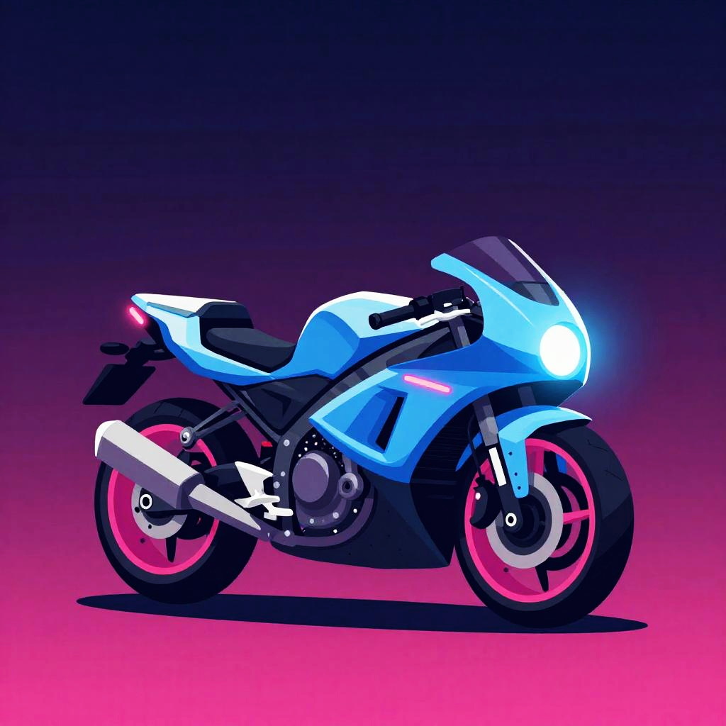 Minimalist vector illustration of a sleek flying motorbike, glowing neon lights, electric blue and hot pink colors, inspired by classic retro-futuristic designs.