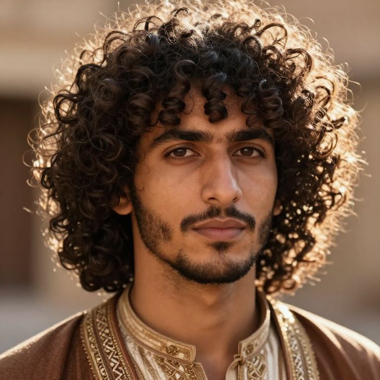 Photograph of a dark-haired, bearded man with medium brown skin wearing a golden crown adorned with blue gemstones. He has a serious expression and a thin mustache. He is dressed in a dark blue robe with intricate gold embroidery along the edges and wears multiple gold necklaces, including one with a circular pendant. The background is blurred, featuring indistinct people and a light-colored building. The man's black hair is shoulder-length and slightly wavy. The image has a realistic, detailed style, emphasizing the regal and traditional attire.