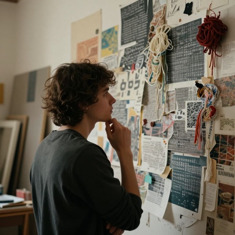 A cinematic shot of a focused individual in a cluttered art studio, mid-thought, their face neutral and thoughtful, facing a wall covered in overlapping textures—frayed yarn, torn paper, and digital noise patterns—fusing together to create a visual storm, with warm, uneven lighting and natural shadows enhancing the sense of confusion and complexity.