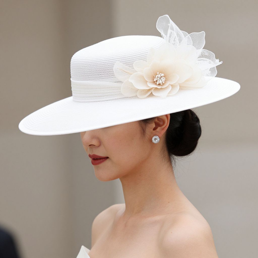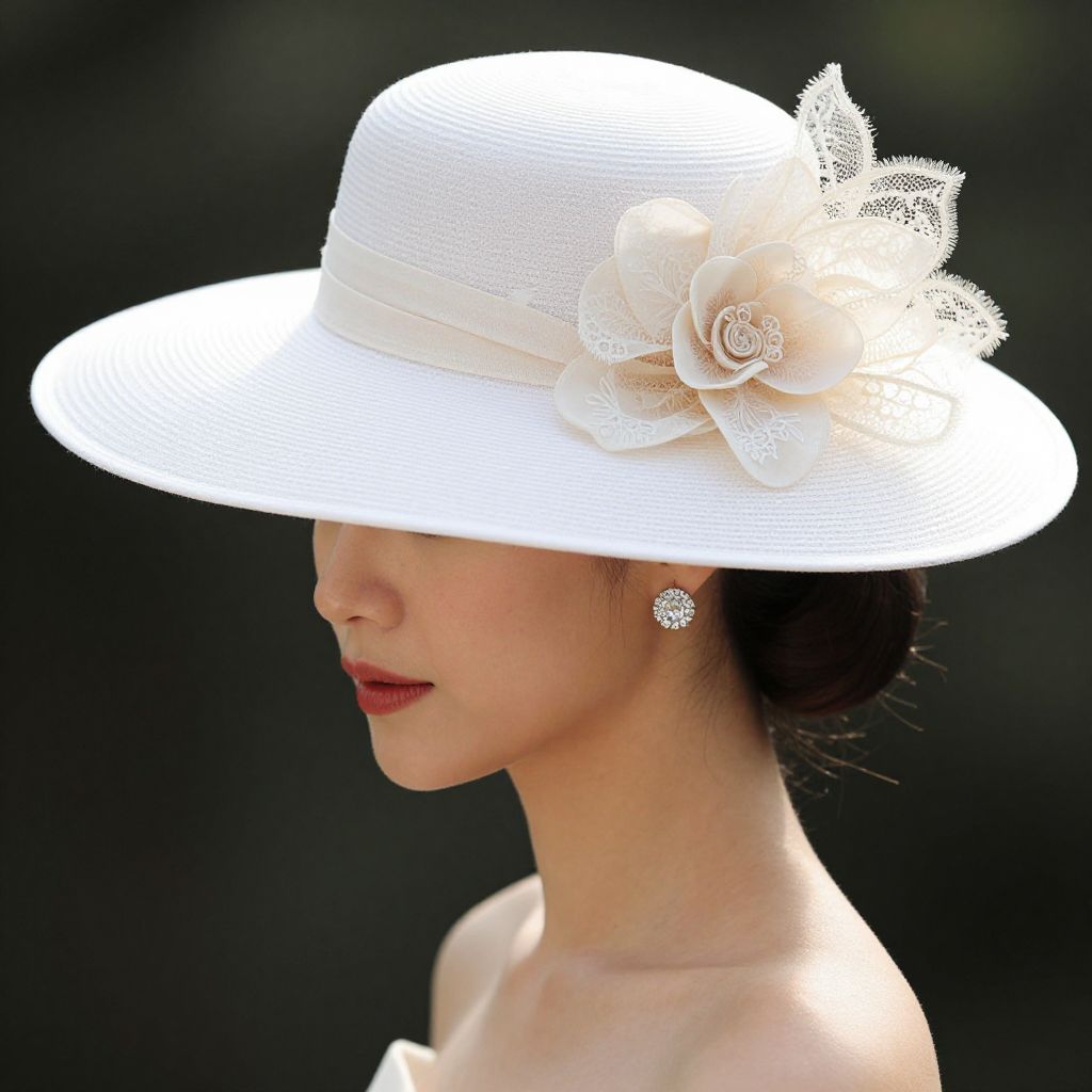 Elegant woman wearing a wide-brimmed white hat adorned with a delicate cream flower and lace detail, complemented by a chic updo hairstyle and sparkling diamond earrings, showcasing Joanne Edwards Millinery's refined craftsmanship.