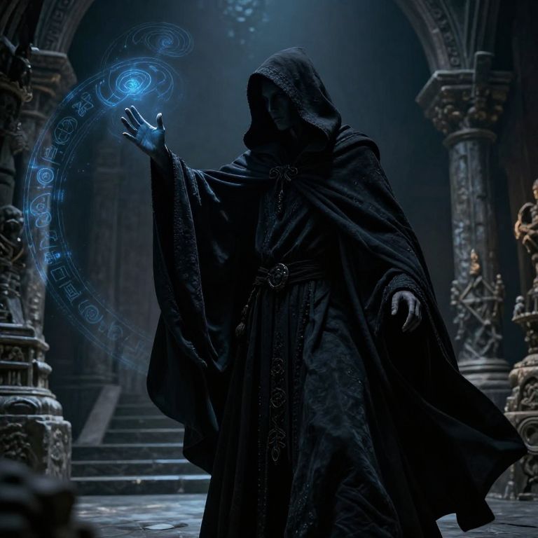 Black cloak with hood enveloping a shadowy mage casting a spell in an ancient stone chamber, swirling magical runes glowing faint blue, dramatic lighting focused on fabric details, ultra-detailed fantasy digital art.