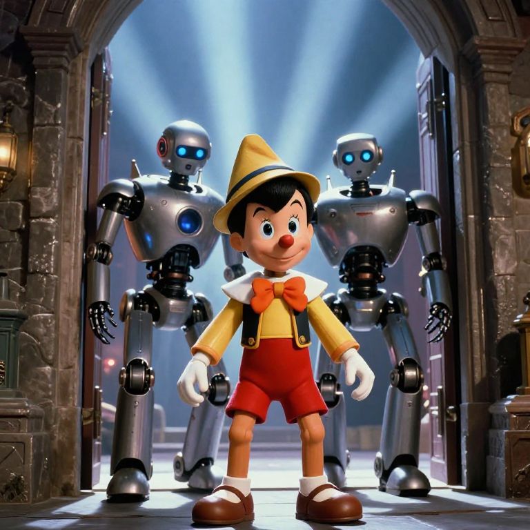 Pinocchio film still, two futuristic robots emerging from a castle doorway as lights shine behind, style by conan the barbarian 1982,
