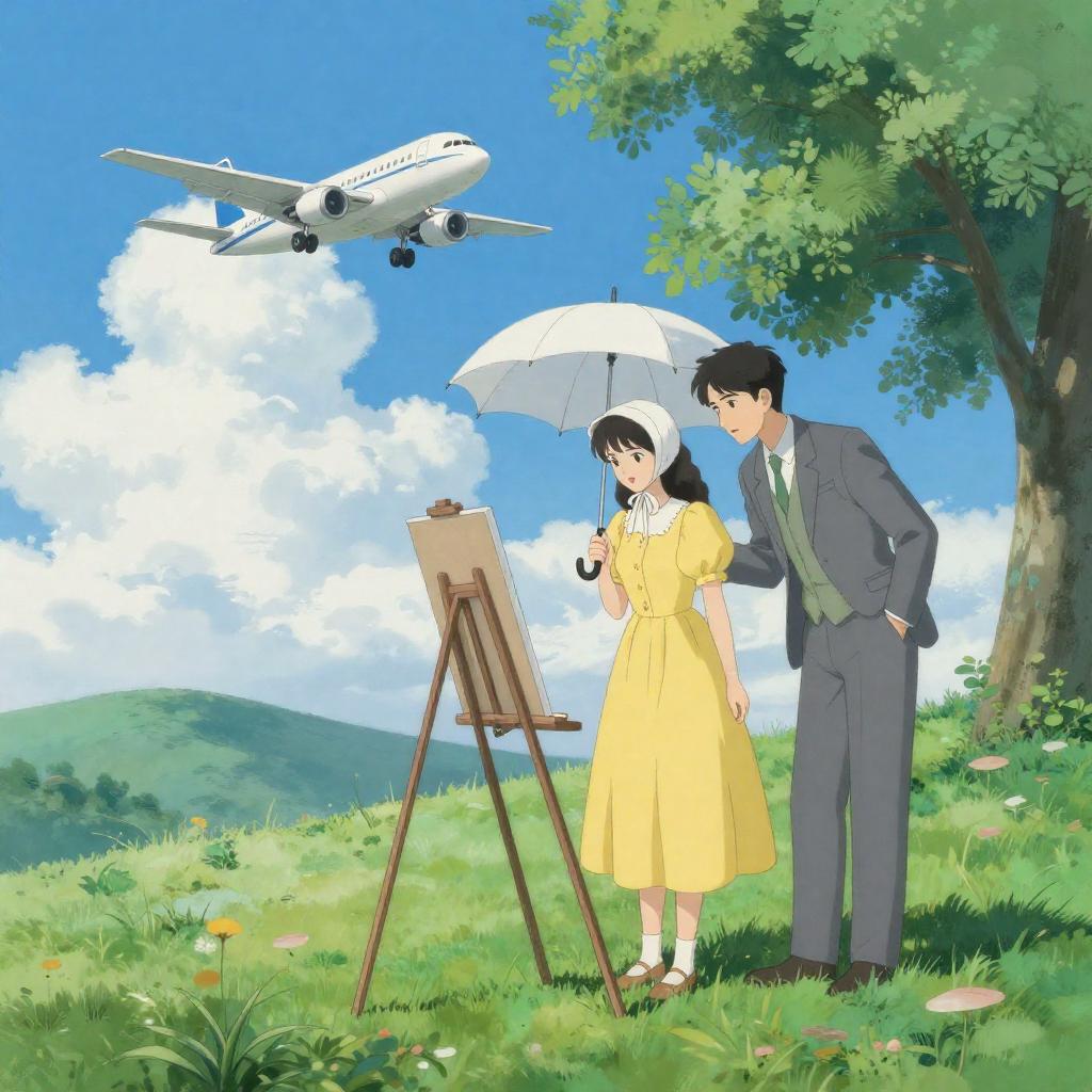 Anime-style painting. Woman in yellow dress and white bonnet, holding umbrella, stands beside easel on grassy hill. Man in gray suit leans over easel. White airplane flies above. Fluffy white clouds against bright blue sky. Green tree on right.