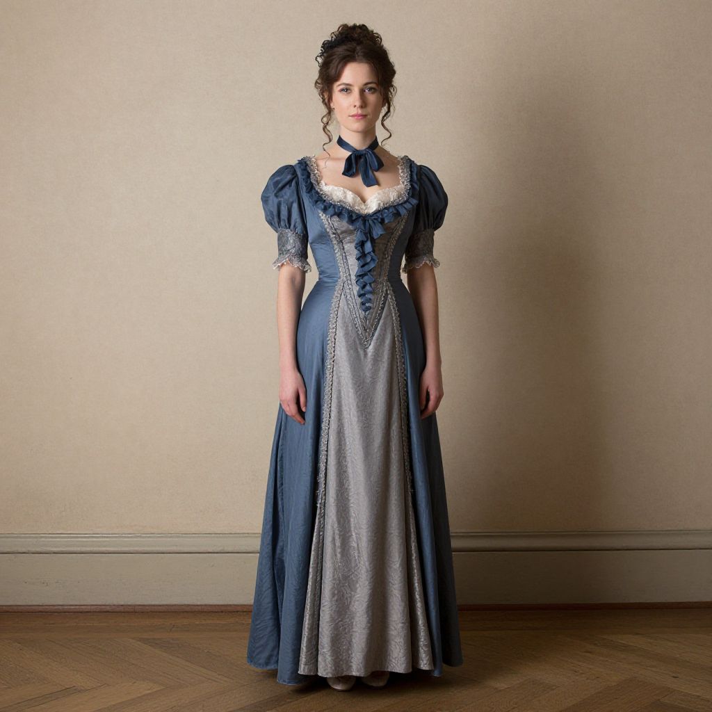 "Victorian Fancy Dress Ball, woman in a blue and grey dress standing in front of a wall"
