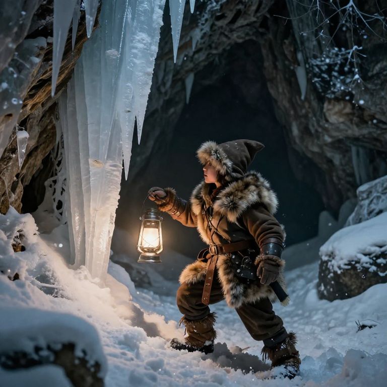 Photograph of a rugged, fur-clad adventurer with a lantern, standing in a snow-covered cave with icicles, illuminated by soft light.