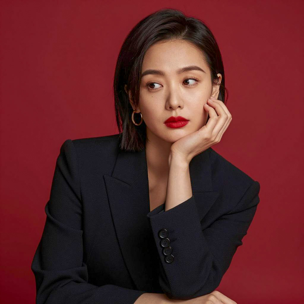 Portrait of an Asian woman with short black hair wearing a black blazer and red lipstick. She is posed against a solid red background, resting her head on her hand and looking to the side with a neutral expression. She accessorizes with gold hoop earrings.