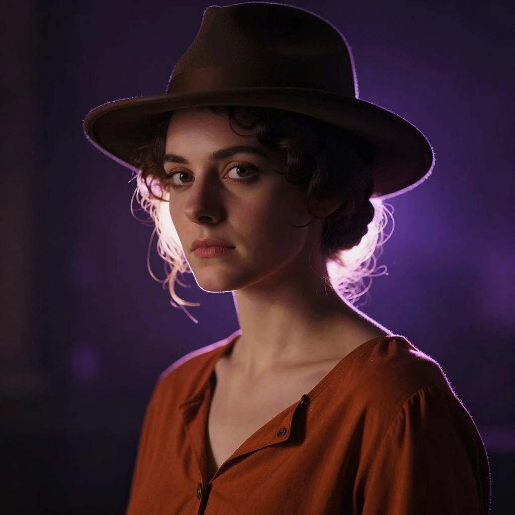 Photograph of a young woman with pale skin and curly dark brown hair, wearing a brown felt hat and a loose, orange-brown V-neck shirt. She has a serious expression with slightly furrowed brows and dark, almond-shaped eyes. The background is a dark, gradient purple, with a bright, white light source behind her head, creating a halo effect. The lighting emphasizes her facial features and the texture of her shirt. The overall style is moody and dramatic, with a focus on contrast and shadow.