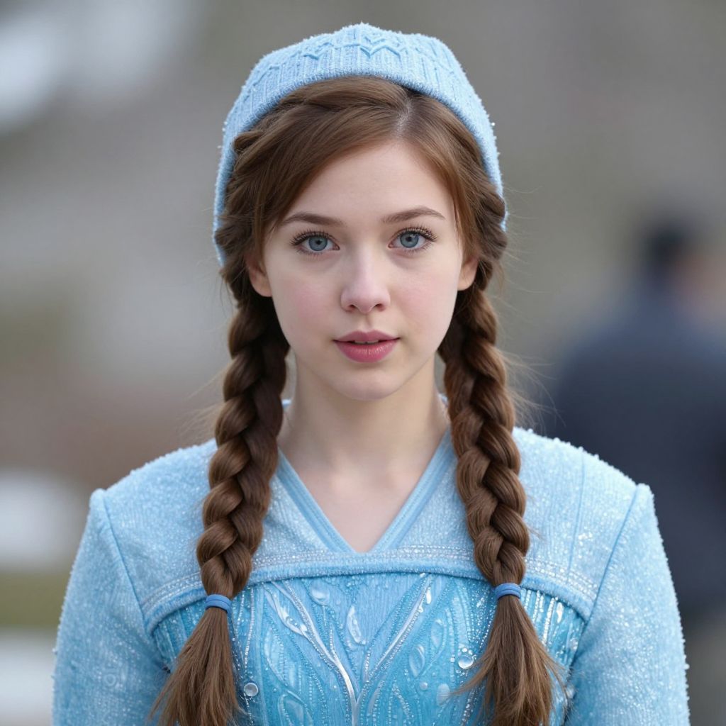Photograph of a young Caucasian woman with fair skin and blue eyes, wearing a light blue, knitted hat and matching long-sleeve dress with intricate, shimmering patterns. She has long, brown hair styled in two braids. The background is blurred, featuring muted, outdoor colors and a distant, out-of-focus figure. Her expression is neutral, with a slight, closed-mouth smile. The texture of her clothing appears soft and cozy, suggesting a cold weather setting. The overall style is whimsical and fairy-tale-like.