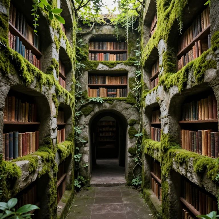 Photograph of a moss-covered, stone library corridor with arched bookshelves, vines, and sunlight filtering through greenery, leading to a dark