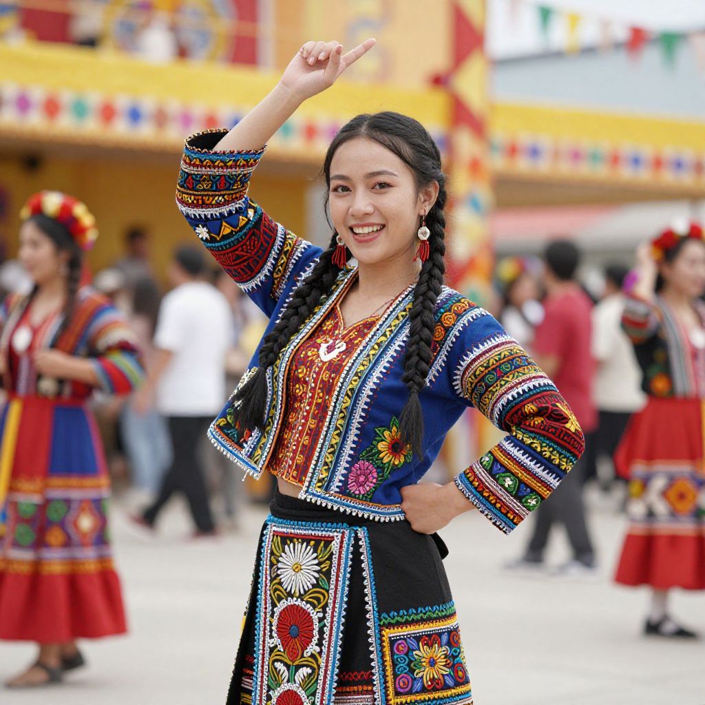 Photograph of a smiling young Asian woman with long black hair in two braids, standing in a vibrant outdoor festival. She wears an intricately embroidered blue, red, and yellow traditional dress with a patterned black apron and white lace earrings. Her right arm is raised, pointing upward, while her left hand rests on her hip. The background features colorful buildings with festive decorations and other dancers in similar traditional attire, some in red dresses. The scene is lively and culturally rich, with blurred figures and bright, warm colors enhancing the festive atmosphere.