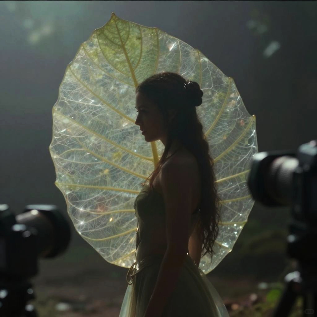 Realistic photo.Subsurface scattering, mystical fairy queen, takes cover behind a giant translucent leaf, body silhouette, sideview, atmospheric haze, Film grain, cinematic film still, shallow depth of field, highly detailed, high budget, cinemascope, moody, epic, OverallDetail, 2000s vintage RAW photo, photorealistic, candid camera, color graded cinematic, atmospheric lighting, imperfections, natural, shallow dof realistic photo
