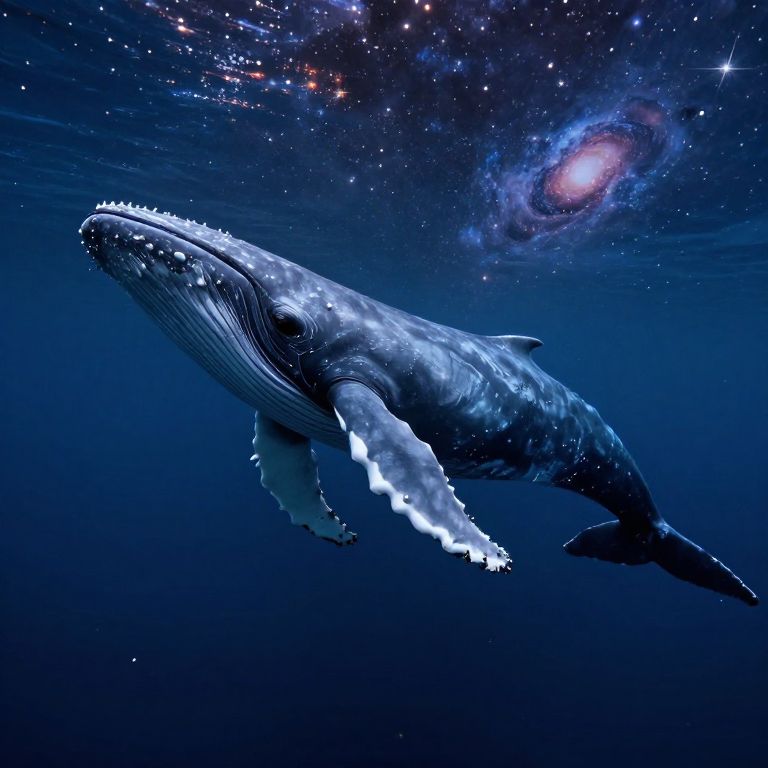 A vivid, digital illustration depicts a massive blue whale swimming in a deep, dark ocean. The whale's textured, white-patched skin and massive, fluked tail are illuminated by ethereal blue light. Above, a star-studded sky with a glowing, spiral galaxy adds a cosmic backdrop. The ocean's gradient from dark blue to black enhances the whale's majestic presence. The image combines realistic marine details with fantasy elements, creating a surreal, otherworldly scene.