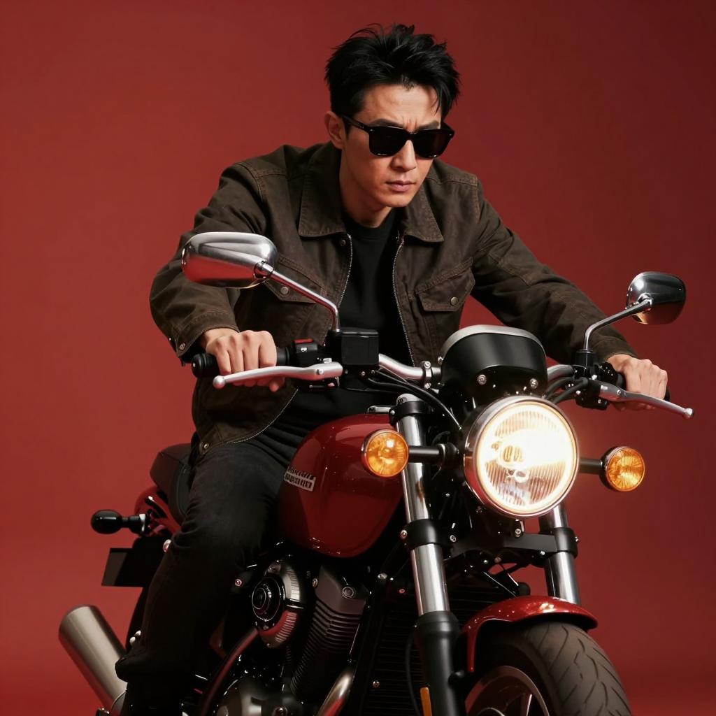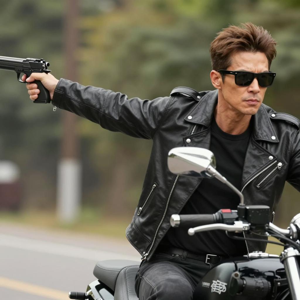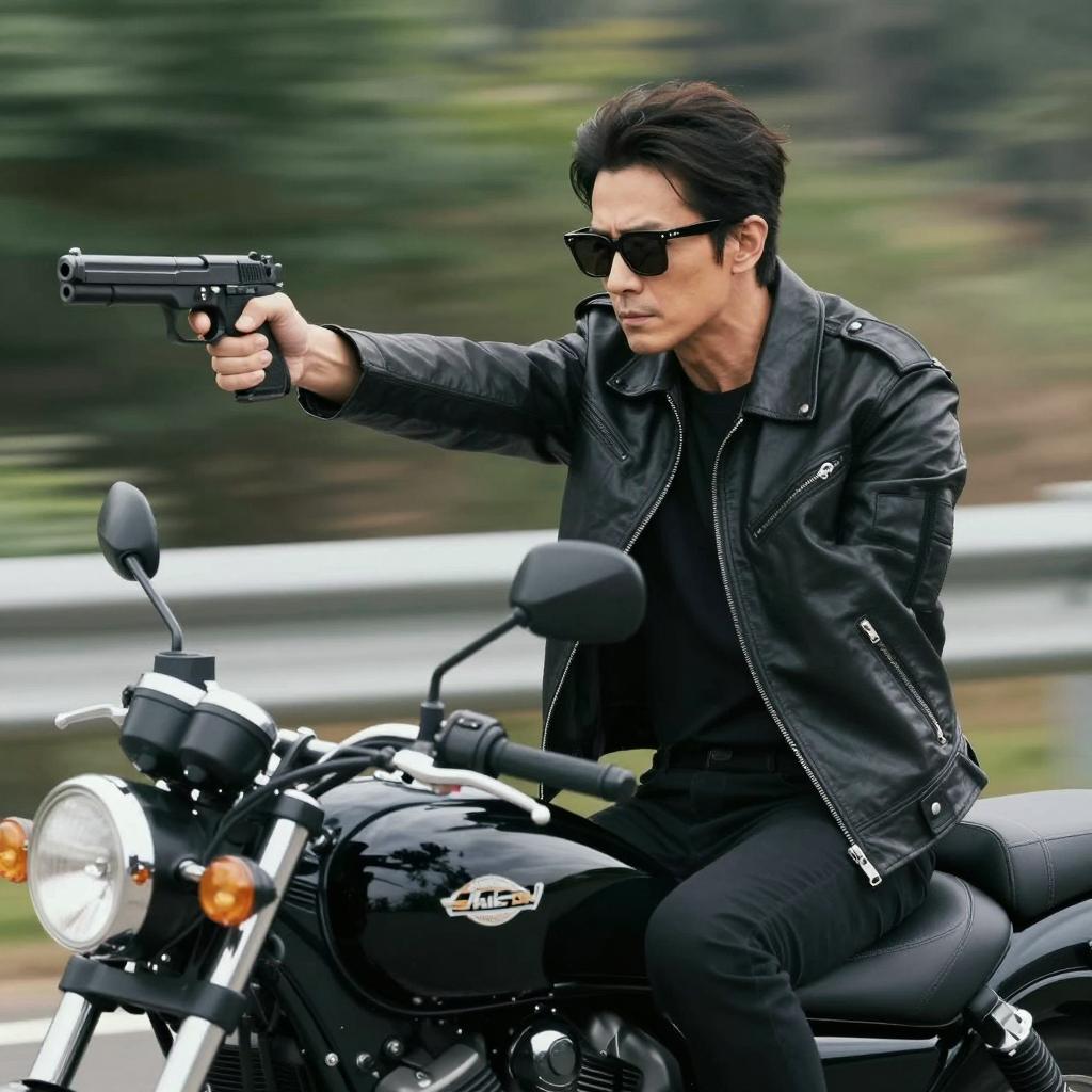 Man with dark hair, black sunglasses, black leather jacket, and black shirt, riding a black motorcycle, holding a black gun with his right hand extended, aiming forward. Blurred green background. Intense expression. Motion blur effect.