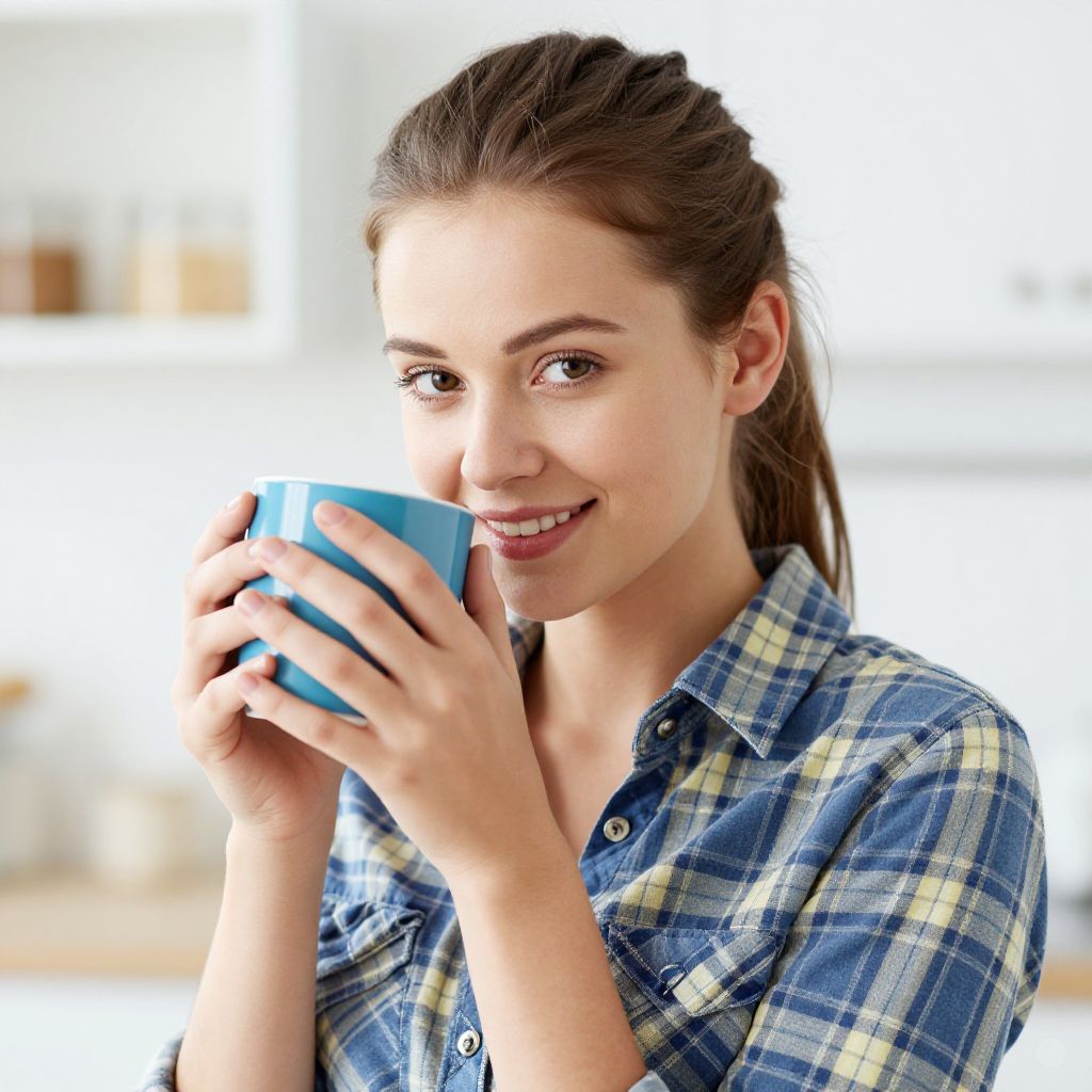Photograph of a young woman with light skin and brown hair pulled back in a ponytail, smiling while holding a blue cup close to her face. She's wearing a blue and yellow plaid shirt. The background is a bright, blurred white kitchen with some indistinct objects on shelves. The image has a watermark in the center and corners.