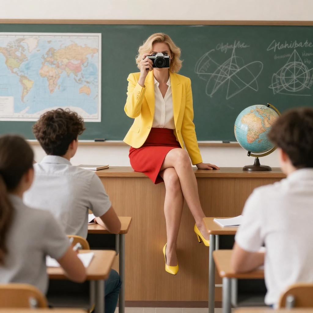 Photograph of a classroom. Blonde woman in yellow blazer, red skirt, and yellow heels sits on desk, holding camera to her face. Two male students in foreground, one writing, one looking at globe. Green chalkboard with map in background. Woman's legs crossed, confident expression. Chalkboard has sketches and writing. Globe on right. Classroom desks in front. Light, neutral colors.