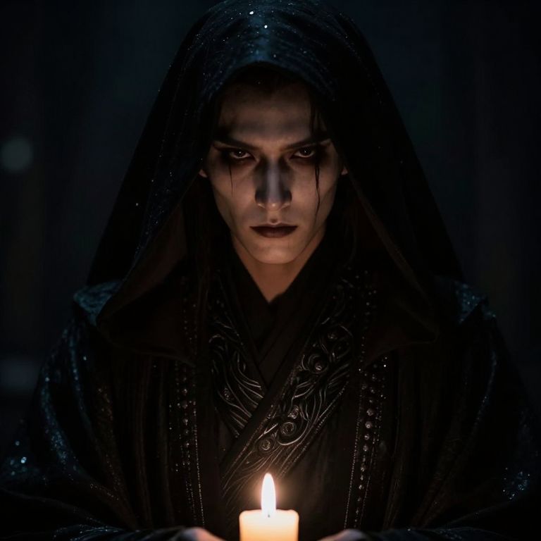 Scuro style portrait of a mysterious figure cloaked in deep shadows, pale face partially lit by soft glowing candlelight, intricate dark clothes with subtle silver patterns, intense and brooding expression, rich texture and dramatic contrast