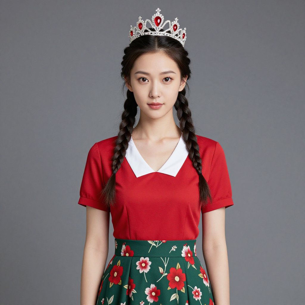 Female model with braids in her hair and a crown on her head. She is wearing a red top with a white collar and a green skirt with red flowers on it.
