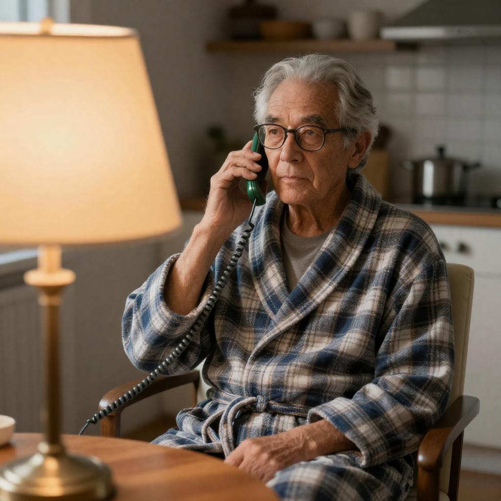 Old man with gray hair and glasses, wearing a plaid bathrobe, sits in a beige chair, holding a green corded phone to his ear. Lamp with a yellow shade on a wooden table to the left, another lamp blurred in the foreground. Kitchen background. Man's expression is focused.
