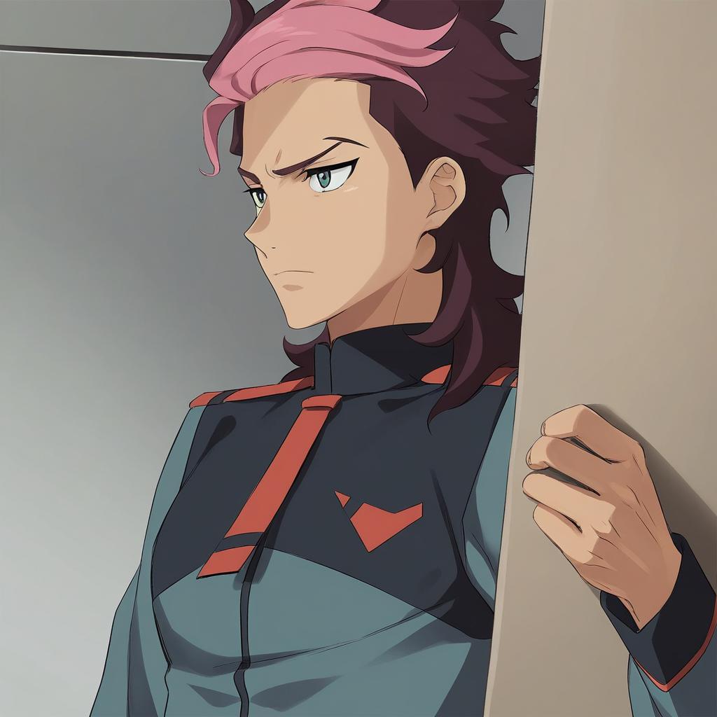 Close-up anime-style illustration of a male character with blue eyes and two-tone long hair (pink and brown). He is wearing a futuristic Asticassia School uniform with red and dark blue accents, looking serious and holding a beige object. The art style is inspired by Gundam series and created by artist Muririn.
